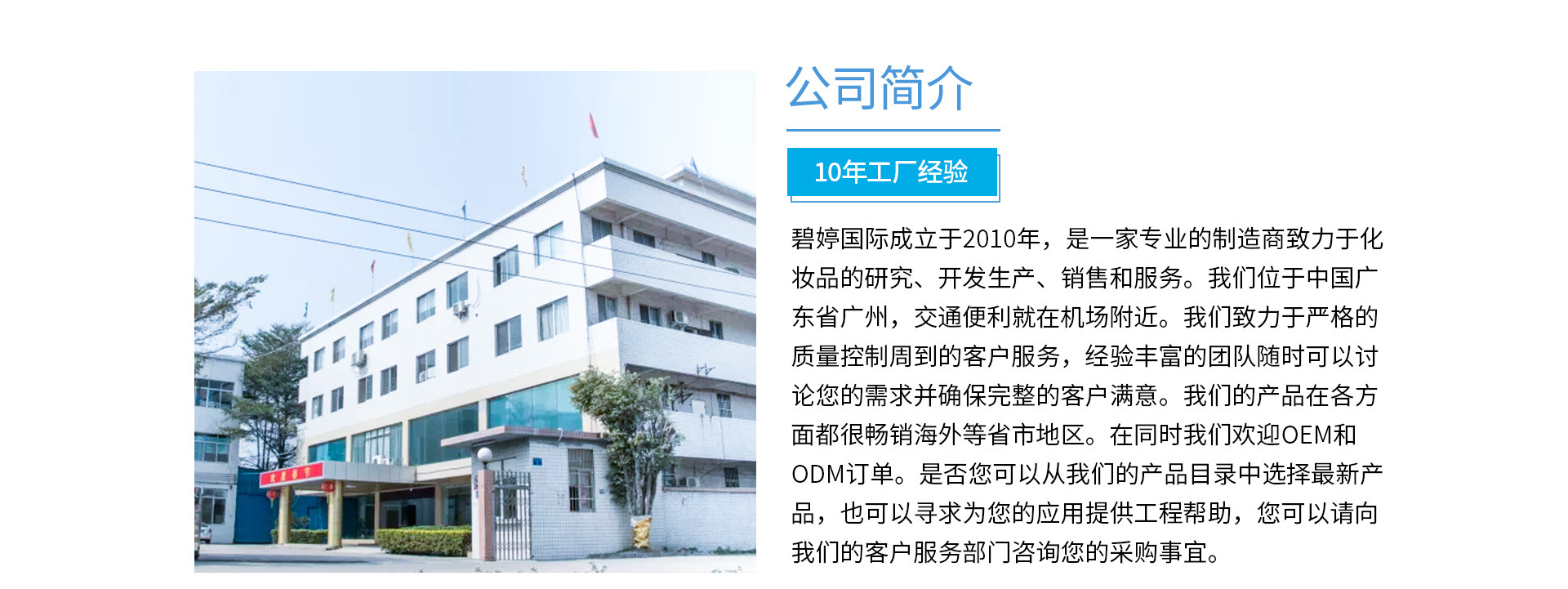 碧婷國際化妝品有限公司成立于2010年,是一家集化妝品經銷批發、招商代理及OEM代加工于一體,規模實力雄厚,在行業內外擁有卓越的口碑。 公司坐落于國內最大的化妝品生產批發采購基地——廣州白云區,憑借四通八達的地域優勢,不斷開拓新的經銷渠道,產品已遠銷全國三十多個省。一直以來,公司始終將研發放在首位,強勢引進韓國領先美容技術,堅持以創新為靈魂,不斷優化提升產品品質,為廣大客戶帶去日新月異的使用體驗。公司旗下各大職能部門通力協作,各司其職,依托科學完善的管理制度,專業的研發團隊,精良的生產設備,以及成熟的物流優勢,贏得了廣大客戶的滿意與認可。 八大子品牌,深耕美容事業 公司旗下擁有千姿、百態、朵朵神速大、戴戴大、豐韻丹姿、聯邦戴戴瘦、聯邦悠悠美、聯邦睡睡瘦等八大子品牌,產品線覆蓋化妝品、護膚品、精油、面膜、豐胸霜等,品類豐富,功效齊全。 多年來,公司始終專注于女性美麗