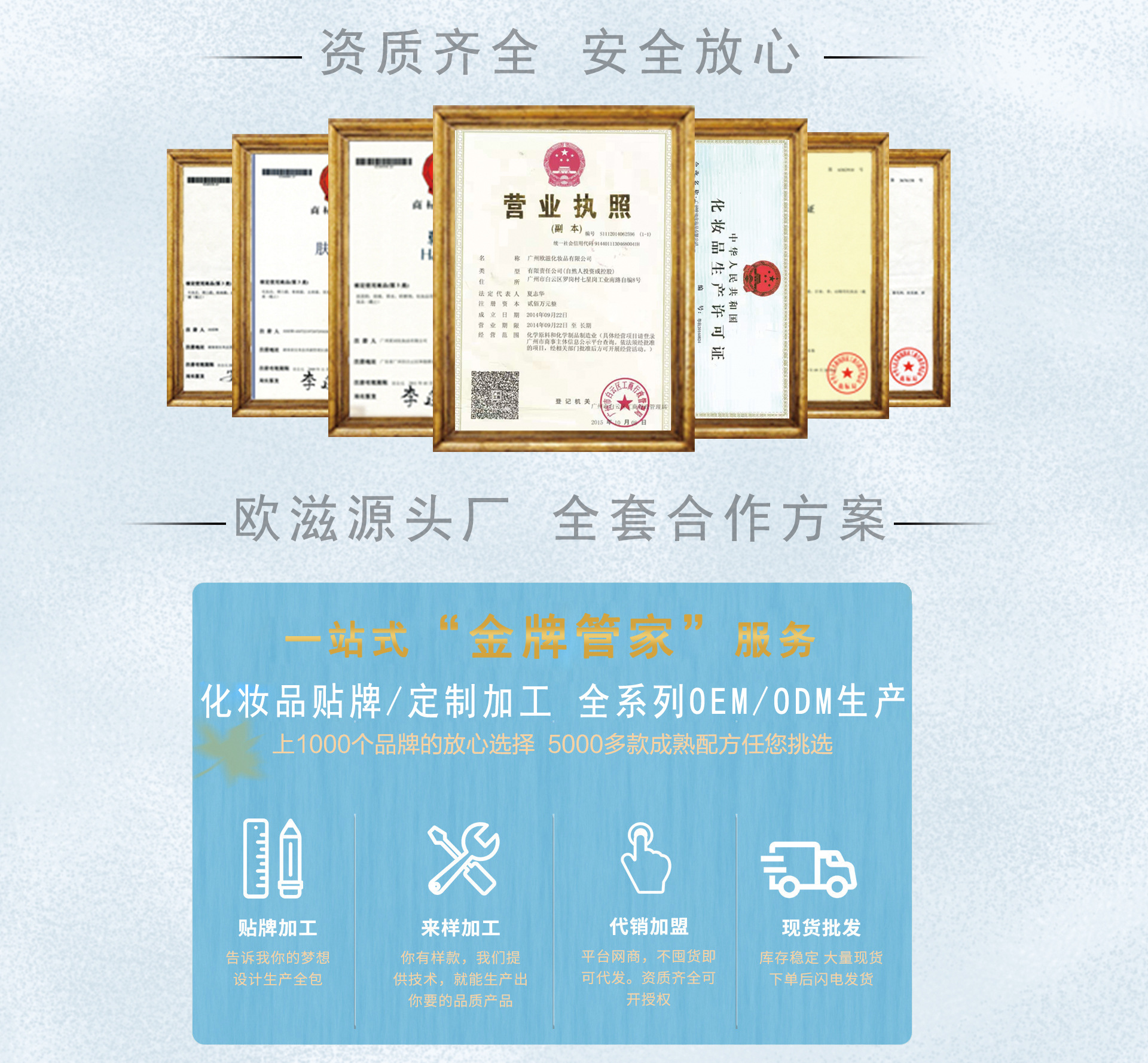 廣州歐滋化妝品有限公司:成立于2014年11月28日,是一家專業從事化妝品、護膚品以及日化產品研發、生產、銷售和代加工(OEM)企業。投資5000萬元,建筑面積12800平米,擁有GMPC標準化妝品生產車間,先進的生產設備和雄厚的技術力量,自成立至今已跨入廣州市化妝品百強企業。 目前擁有國內最先進的電腦控制真空外循環微乳化機設備,一流的檢驗化驗設備,本公司擁有一流的研究開發檢驗檢測中心,本廠的宗旨是:至專、至精、至誠。對客戶極端的負責,提供優質產品與優質服務,讓客戶百分之百的滿意。