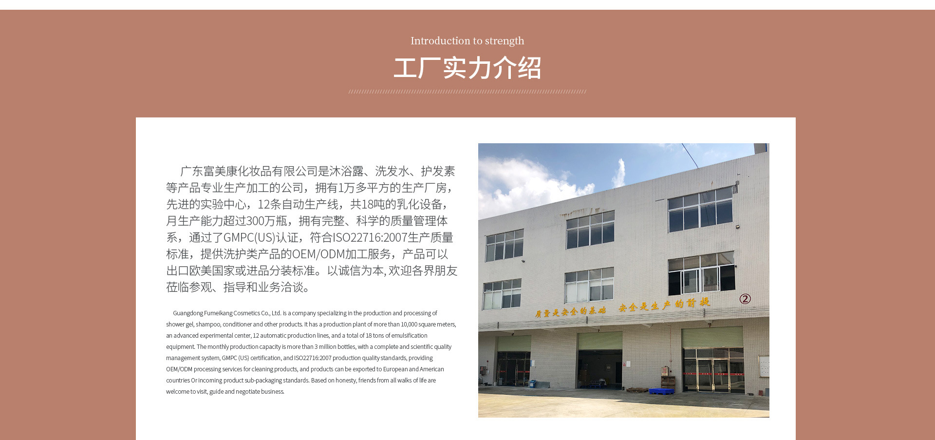 廣東富美康化妝品有限公司是沐浴露、洗發(fā)水、護發(fā)素等產(chǎn)品專業(yè)生產(chǎn)加工的公司,擁有1萬多平方的生產(chǎn)廠房,先進的實驗中心,12條自動生產(chǎn)線,共18噸的乳化設備,月生產(chǎn)能力超過300萬瓶,擁有完整、科學的質量管理體系,通過了GMPC(US)認證,符合ISO22716:2007生產(chǎn)質量標準,提供洗護類產(chǎn)品的OEM/ODM加工服務,產(chǎn)品可以出口歐美國家或進品分裝標準。以誠信為本, 歡迎各界朋友蒞臨參觀、指導和業(yè)務洽談。