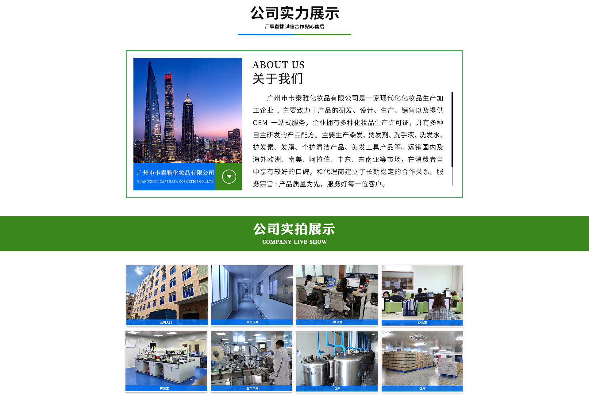 廣州市卡泰雅化妝品有限公司是一家專業的現代化化妝品生產加工企業,主要致力于產品的研發,設計,生產銷售,以及提供優質的OEM一站式服務,企業通過國家權威頒布的生產許可證,擁有多種化妝品生產特證,并擁有多種自主研發的產品配方。 專業生產染發劑,燙發劑,洗手液,洗發水,護發素,發膜,個護清潔產品,美發工具產品等等。暢銷國內及海外歐洲、南美、阿拉伯、中東、東南亞等市場,在消費者當中享有較好的口碑,和代理商建立了長期穩定的合作關系。 服務宗旨:產品質量擺在第一位,服務好每一位客戶。
