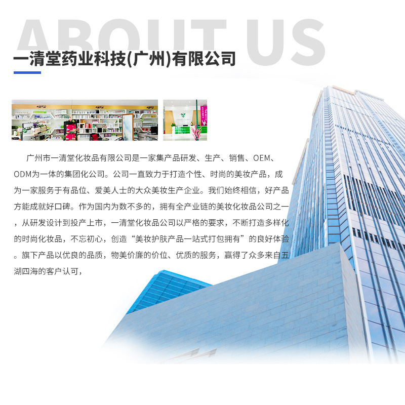 旗下設有一清堂藥業(廣州)科技有限公司、廣州市添姿化妝品有限公司、廣州合創智美生物科技有限公司。公司技術和研發實力雄厚,先后獲得“中國生物科技推動力獎”、“全國質量誠信5A企業”等多項榮譽。公司擁有國際先進設備,十萬級國際GMPC認證的無塵車間,強大的研發團隊及先進、完善的研發設施。主要致力于妝字號、消字號和生物科技的新品研發、生產和銷售,產品通過線下門店、新零售、電子商務、微商等主流渠道在全國擁有眾多知名客戶及外貿市場客戶,合作數量及銷量位居行業前列。