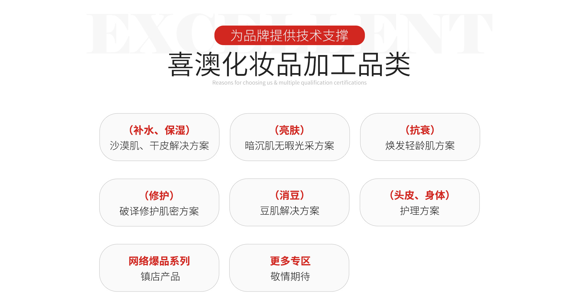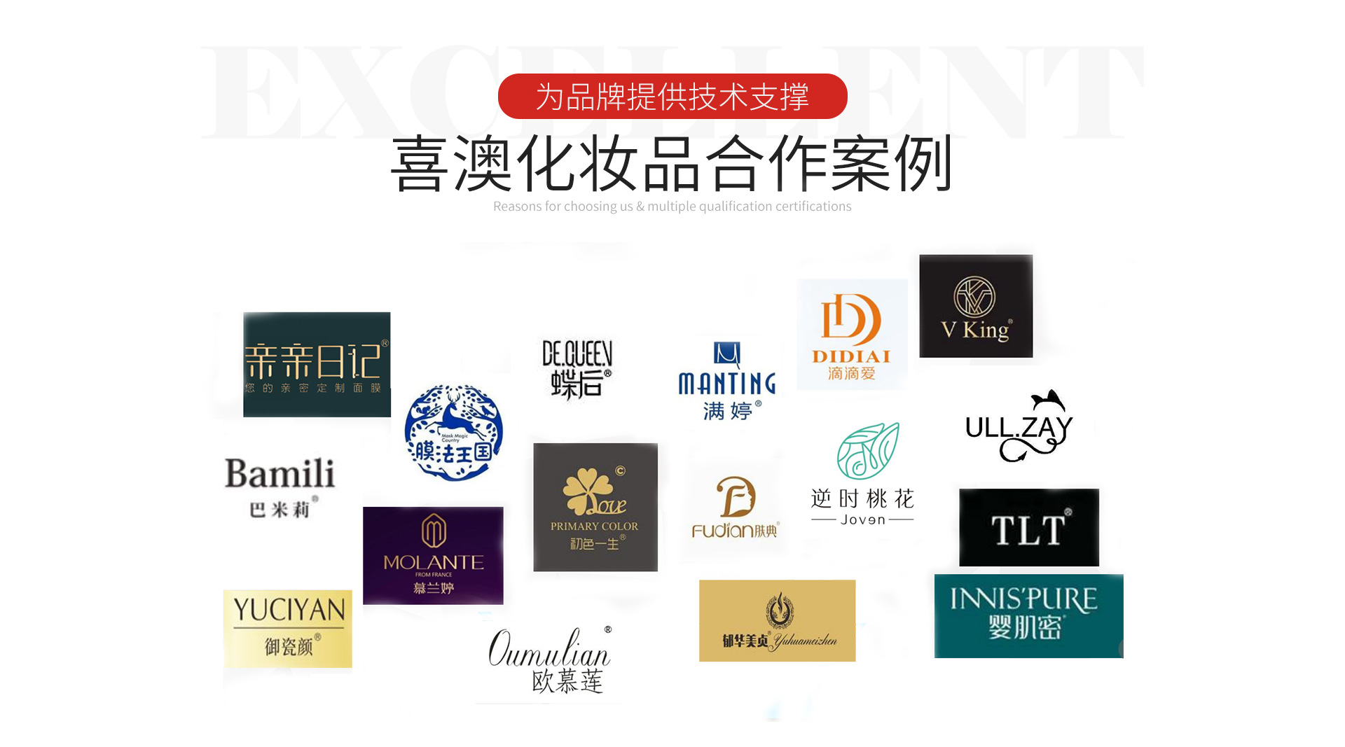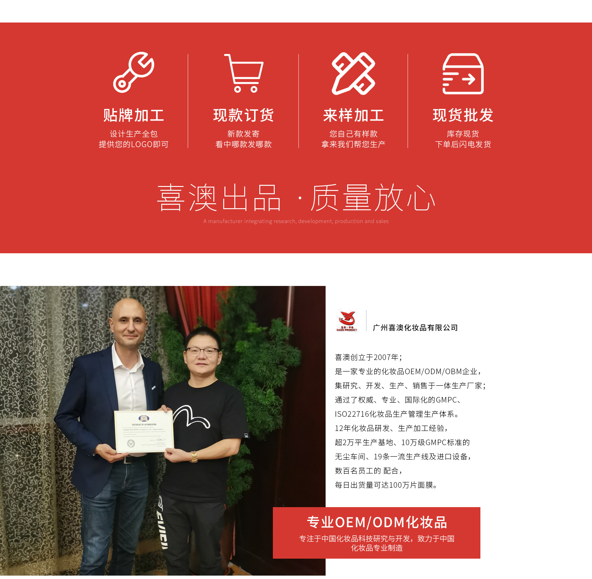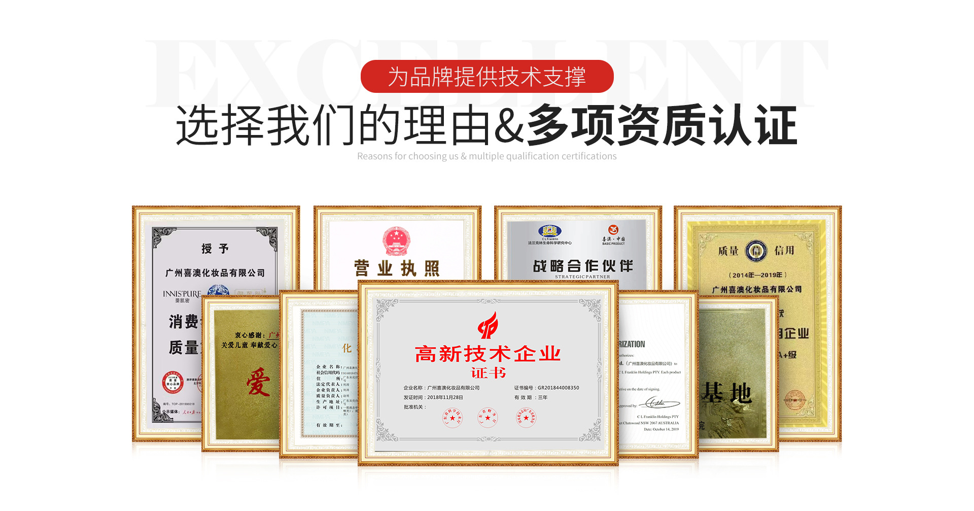 廣州喜澳化妝品有限公司創(chuàng)立于2007年;是一家專業(yè)的化妝品OEM/ODM/OBM企業(yè),集研究、開發(fā)、生產(chǎn)、銷售于一體生產(chǎn)廠家;通過了權(quán)威、專業(yè)、國際化的GMPC、ISO22716化妝品生產(chǎn)管理生產(chǎn)體系。 13年專注于亞洲人肌膚問題護理研究,在美白、祛斑、抗敏、抗衰老、頭皮護理等護膚領(lǐng)域,成功的獲得多項研究成果;于2018年獲得國家認定為《高新技術(shù)企業(yè)》。 嬰肌密、御瓷顏、逆時桃花、蝶后、膜法王國等多個知名品牌均為喜澳公司旗下消費者最信賴品牌。產(chǎn)品涉及面膜、日常護膚、時尚彩妝、洗護用品、母嬰兒童用品、男士護膚、居家護膚套裝全品類,銷售渠道涉及日化線、專業(yè)線、電商、微商、淘寶、天貓、抖音及快手等網(wǎng)紅直播各大平臺!
