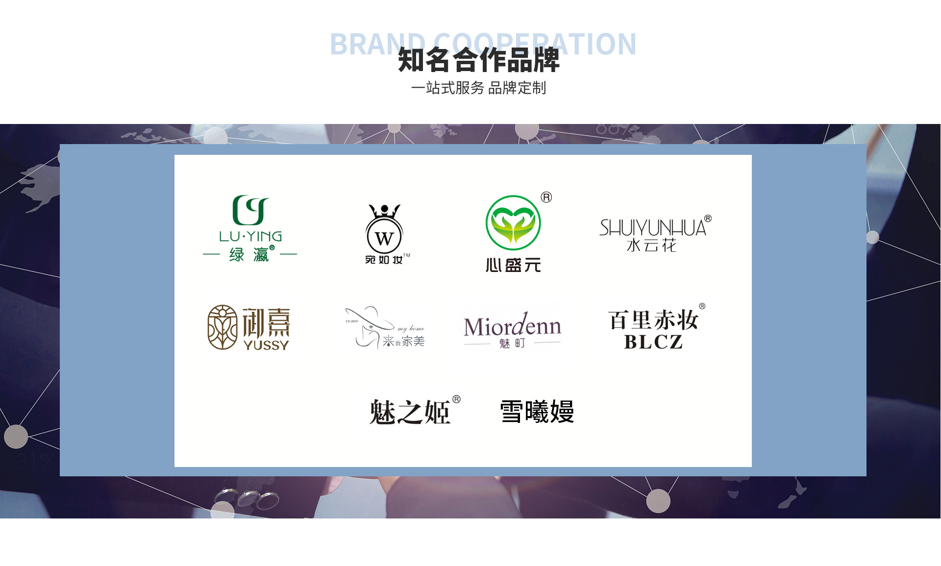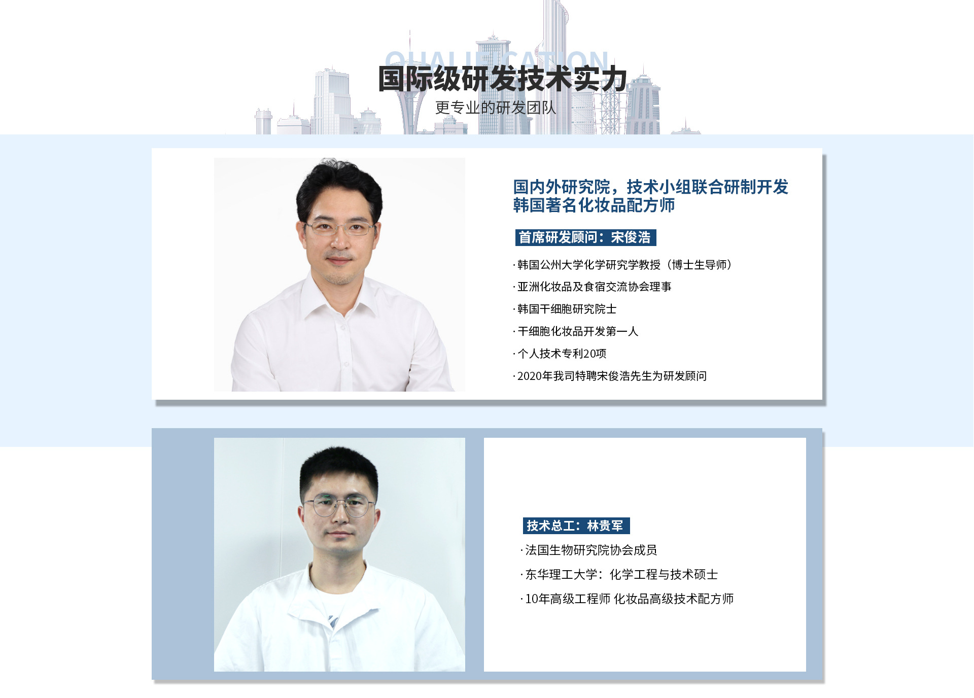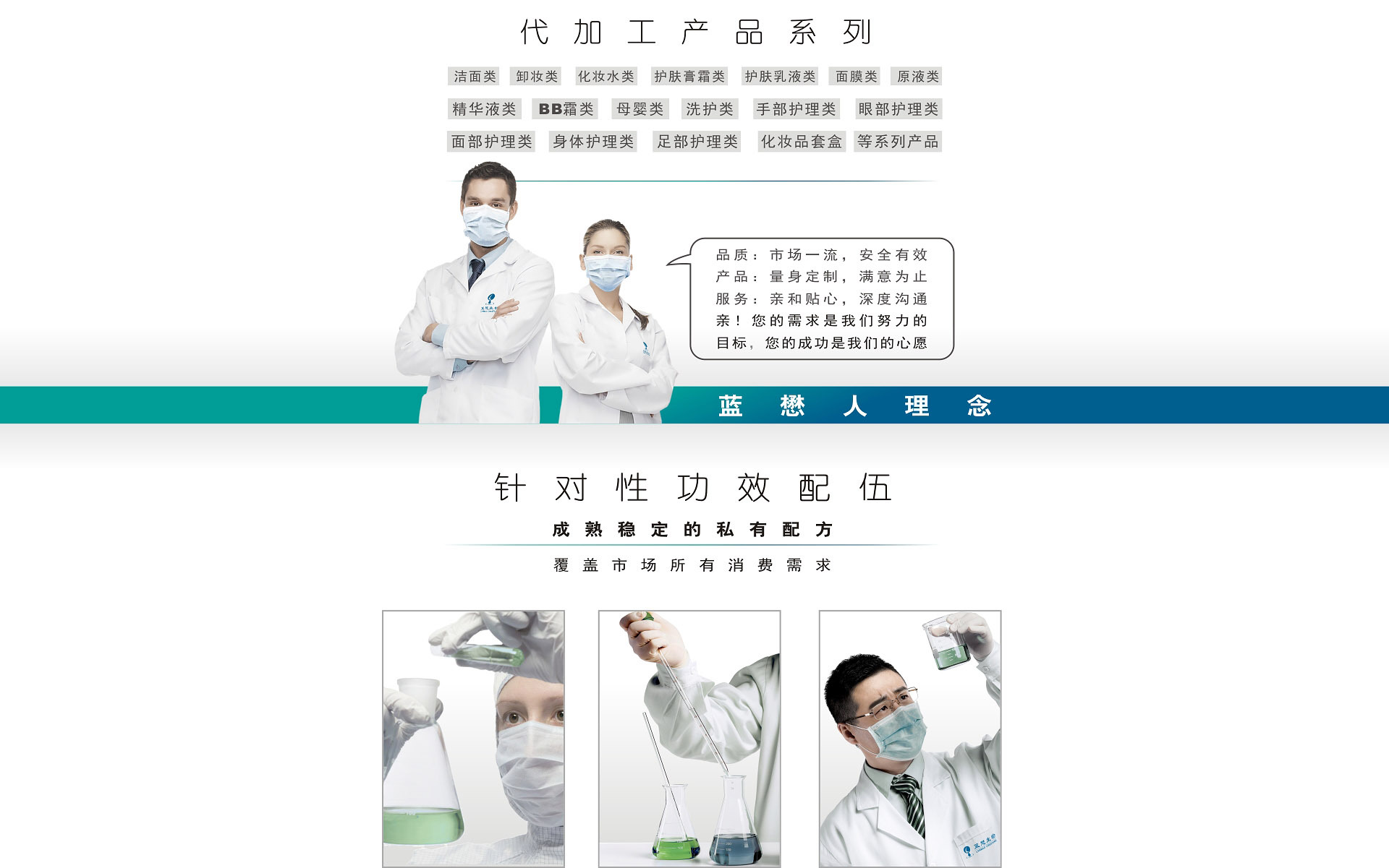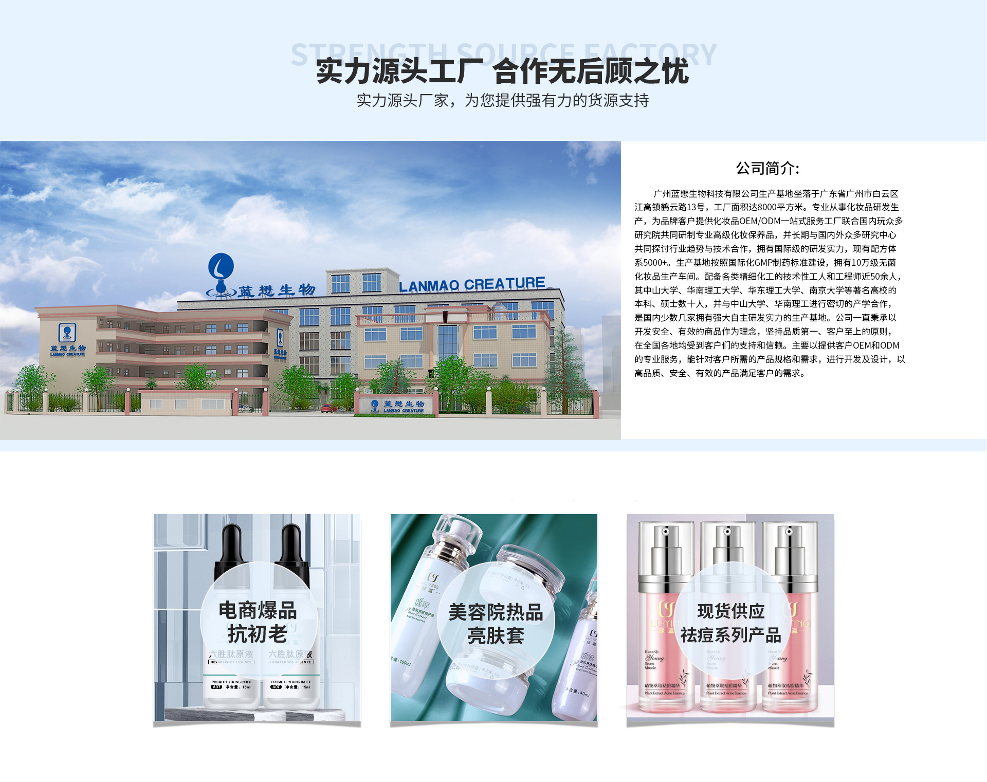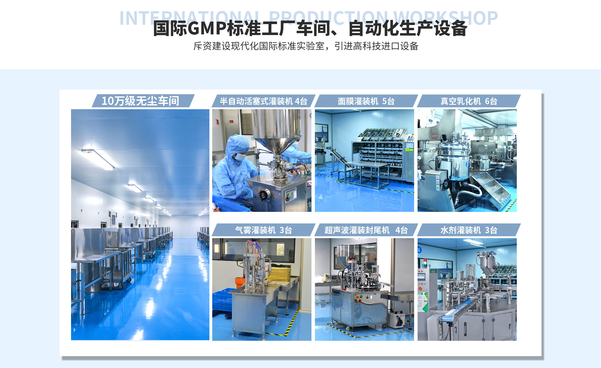 生產基地坐落于風景宜人的廣州白云湖附近,距廣州市中心區僅30公里,各類生產車間達8000平方米。基地環境優美,空氣質量良好。 主要以專業高級化妝保養品的研究、開發為主,并與國內外眾多研究中心達成技術合作,擁有國際級的研發與制造實力。 生產基地按照GMP制藥標準建設,擁有10萬級無菌化妝品生產車間。擁有各類精細化工的技術性工人和工程師50余人,其中山大學、華南理工大學、華東理工大學、南京大學等著名高校的本科、碩士數十人,并與中山大學、華南理工進行密切的產學合作,是國內少數幾家擁有強大自主研發實力的生產基地。 公司一直秉承以開發安全、有效的商品作為理念,堅持品質第一、客戶至上的原則,在全國各地均受到客戶們的支持和信賴。 公司主要以提供客戶OEM和ODM的專業服務,能針對客戶所需的產品規格和需求,進行開發及設計,以高品質、安全、有效的產品滿足客戶的需求