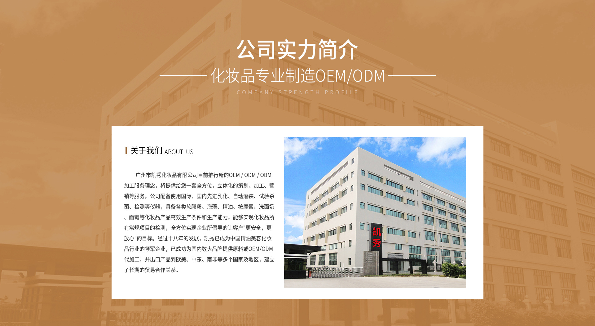 我們是一家集科研、開發(fā)、設計、生產、銷售、OEM/ODM于一體的專業(yè)化妝品生產現代化企業(yè)。本著前衛(wèi)的眼光,豐富的經驗,專業(yè)的技術及優(yōu)異的品質,致力于不斷開拓出更尖端、更能引導時尚潮流的“高、精、新”產。產品行銷全國,并出口東南亞、港臺、俄羅斯、韓國、日本、美國等國家和地區(qū)。 先進的科研和強大的生產能力,是凱秀騰飛的基礎保障。在激烈的市場競爭中,凱秀堅持民族化品牌走民族振興之路,始終以東方草本與現代化尖端科技相結合的先進理念,其中開發(fā)的草本系列產品,受到消費者的熱烈追捧,更成為持續(xù)暢銷的精典產品。目前,凱秀從德國和美國引進了國際尖端生產設備嚴格按照ISO9002-2000標準生產,嚴格保證每一出廠產品的質量。雄厚的技術力量,先進的生產設備,多年OEM服務之精髓,大大開拓了國內外OEM業(yè)務,受到國內外客戶的認同并取得了良好的市場反應。