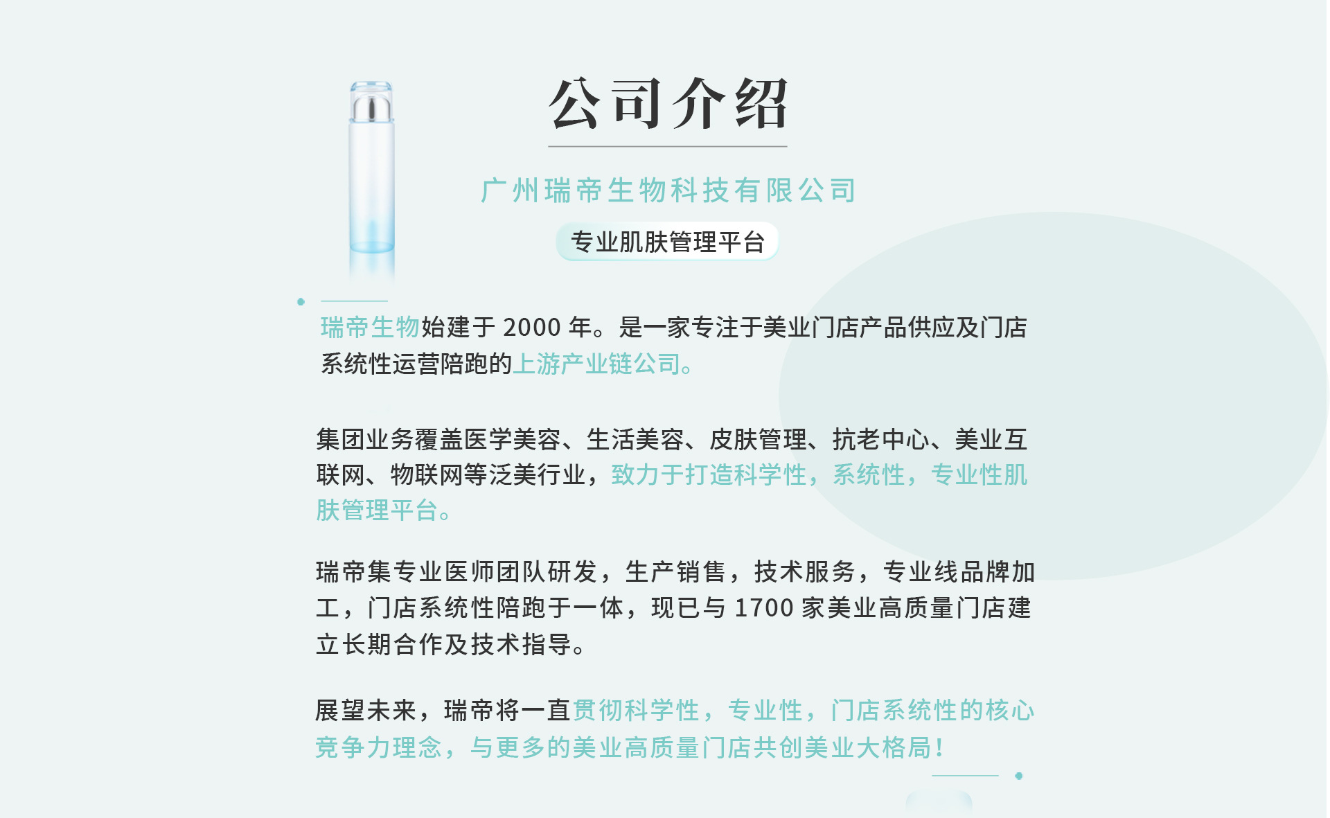 瑞帝生物2000年成立 是一家專注化妝品的現代化生產企業 集化妝品研制開發,生產銷售,技術服務,專業品牌加工為一體的企業 瑞帝生物提供妝字號 械字號護膚產品 面膜、面霜霜、乳液、精華等美容化妝品一站式OEM/ODM服務 瑞帝生物合作客戶,來自專業院線、實體店、電商、微商、直播等多個渠道代工客戶超過300家 提供從產品文案策劃、產品包裝設計、產品宣傳素材設計、推廣模式打造、產品培訓服務一站式ODM服務 一直在致力于為客戶提供高品質、高質量、和健康的好產品,讓消費者放心,用得安心。