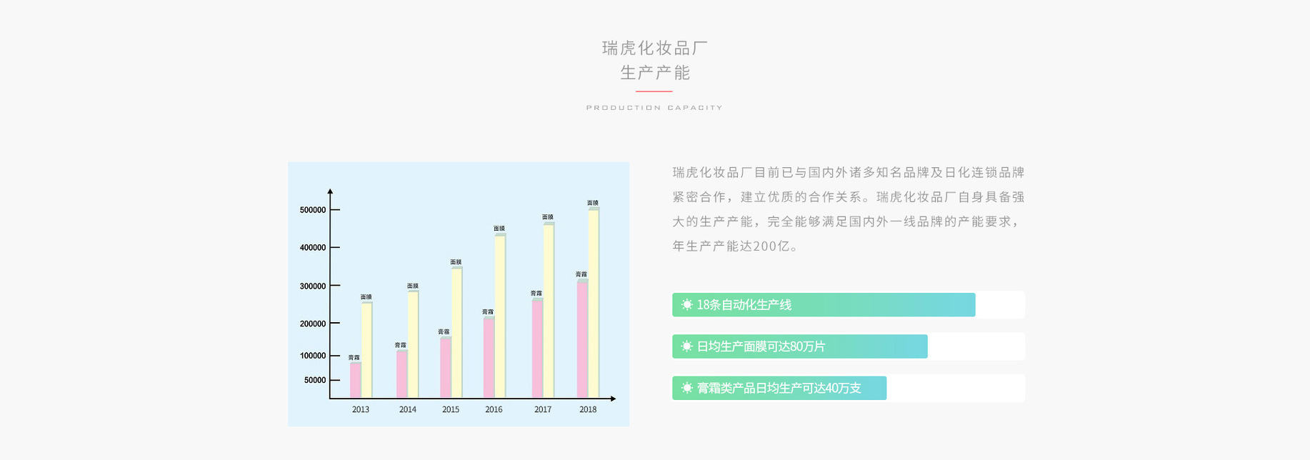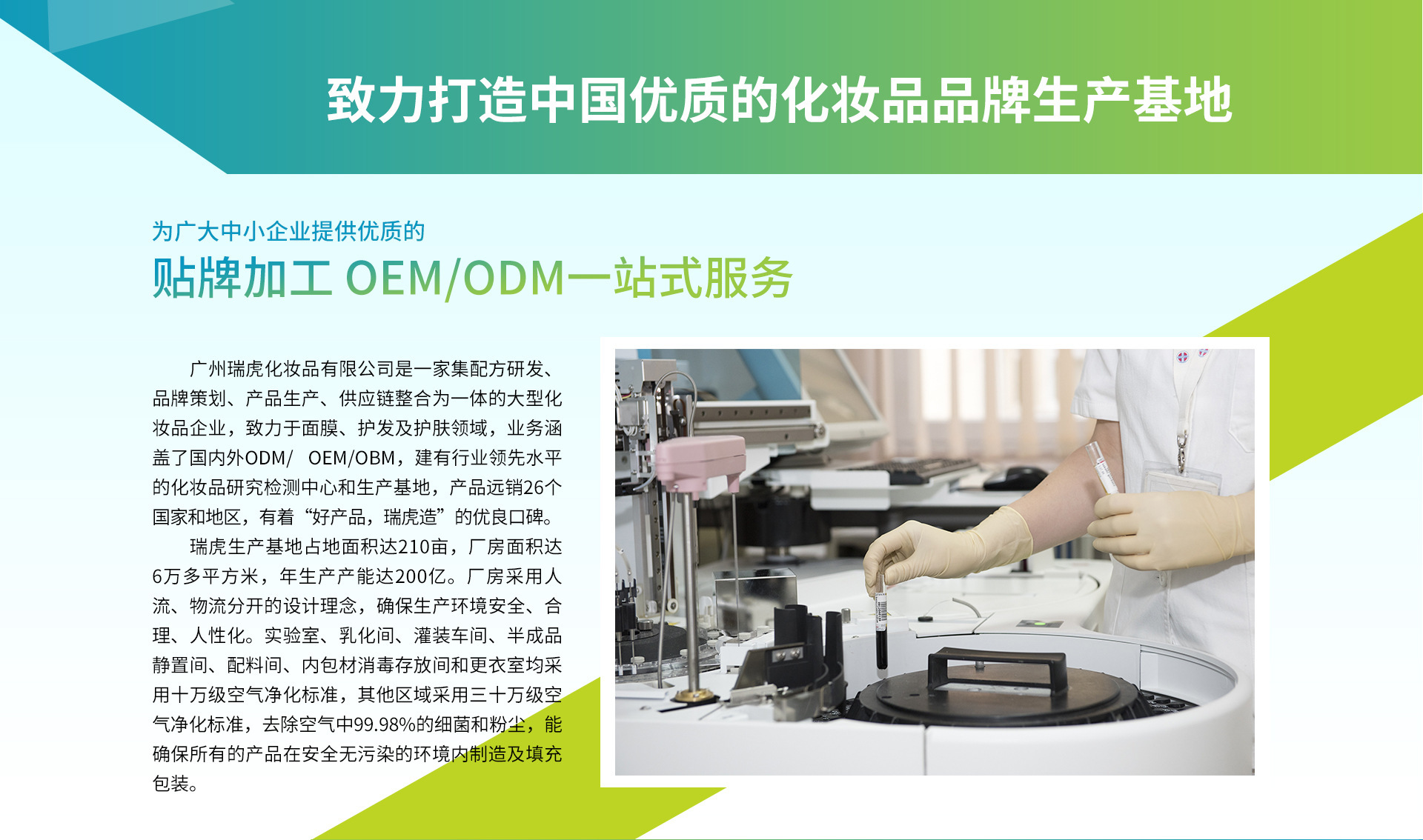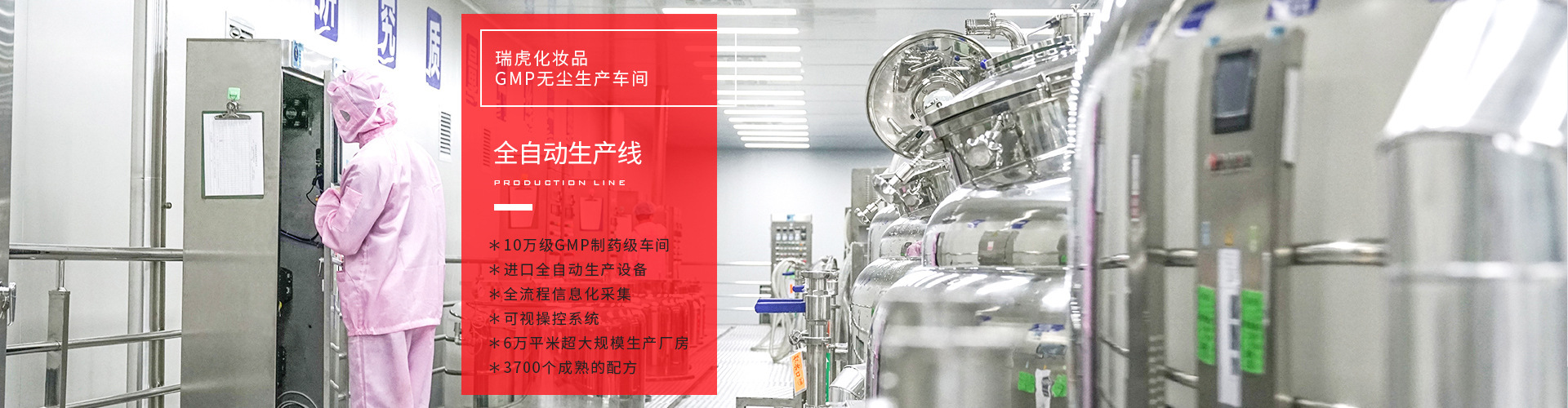 廣州瑞虎化妝品有限公司是一家集配方研發、品牌策劃、產品生產、供應鏈整合為一體的大型化妝品企業,致力于面膜、護發及護膚領域,業務涵蓋了國內外ODM/OEM/OBM,建有行業領先水平的化妝品研究檢測中心和生產基地,產品遠銷26個國家和地區,有著好產品,瑞虎造”的優良口碑。 瑞虎生產基地占地面積達210畝,廠房面積達6萬多平方米,年生產產能達200億。廠房采用人流、物流分開的設計理念,確保生產環境安全、合理、人性化。實驗室、乳化間、灌裝車間、半成品靜置間、配料間、內包材消毒存放間和更衣室均采用十萬級空氣凈化標準,其他區域采用三十萬級空氣凈化標準,去除空氣中99.98%的細菌和粉塵,能確保所有的產品在安全無污染的環境內制造及填充包裝