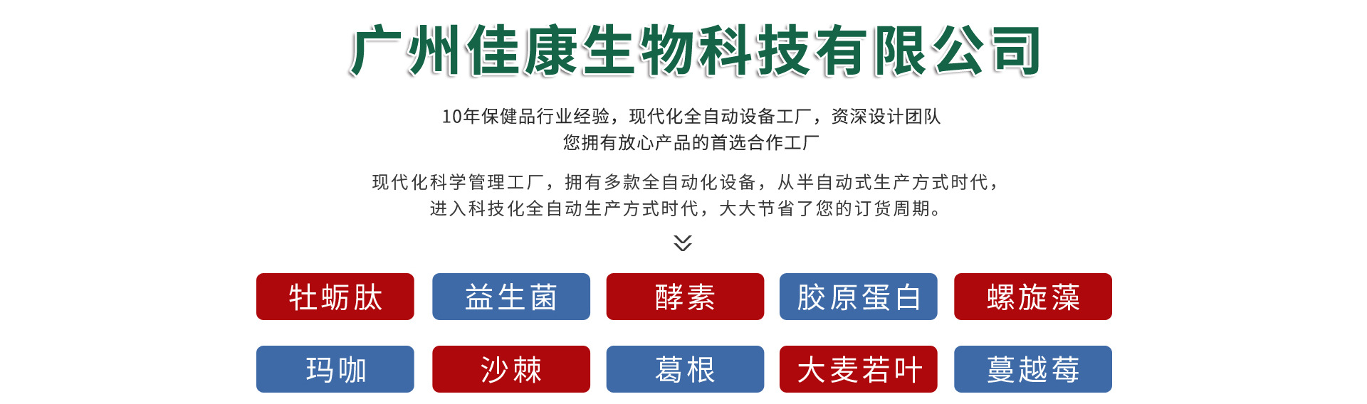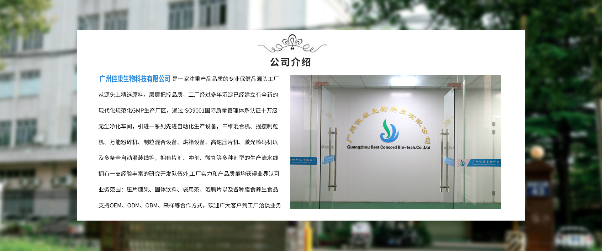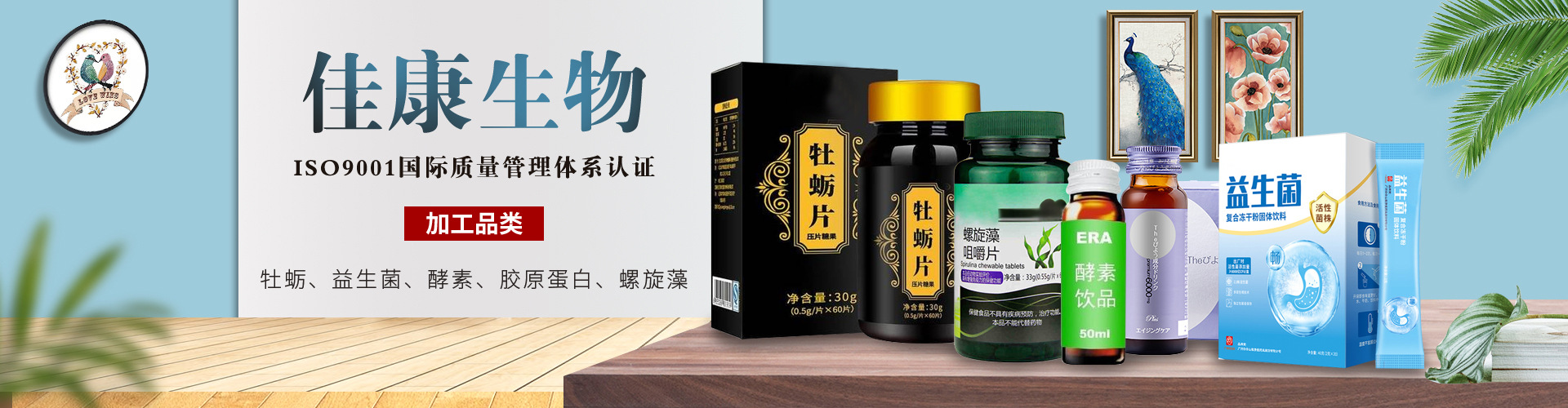 廣州佳康生物科技有限公司是壓片糖果、固體飲料、袋泡茶;男性片劑、女性片劑、老人保健品、少兒保健品、原料等產(chǎn)品專業(yè)生產(chǎn)加工的公司,擁有完整、科學(xué)的質(zhì)量管理體系,通過ISO90001質(zhì)量管理體系認(rèn)證。廣州佳康生物科技有限公司的誠信、實力和產(chǎn)品質(zhì)量獲得業(yè)界的認(rèn)可。歡迎各界朋友蒞臨參觀、指導(dǎo)和業(yè)務(wù)洽!