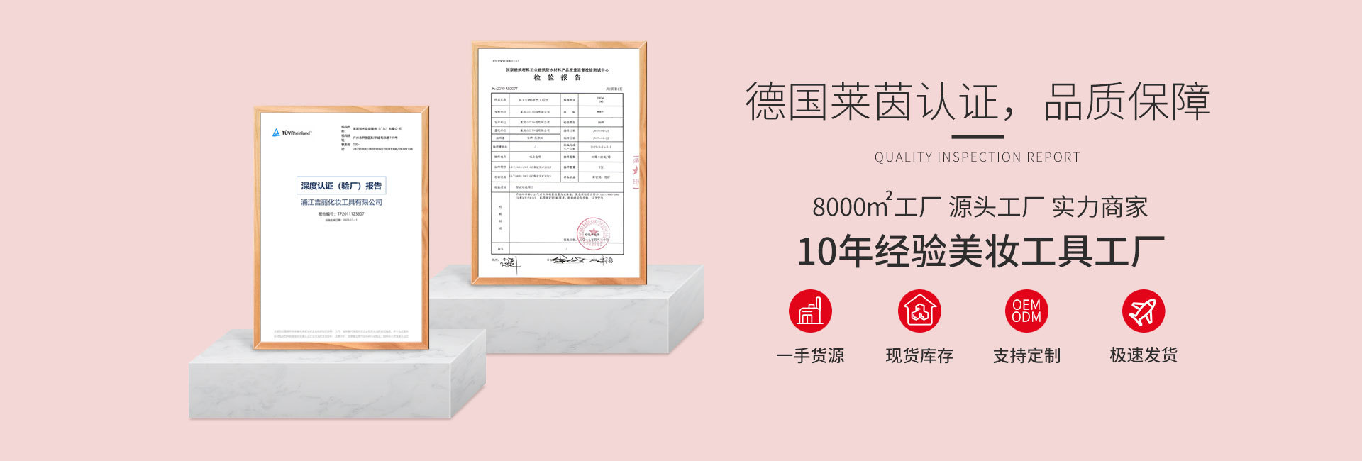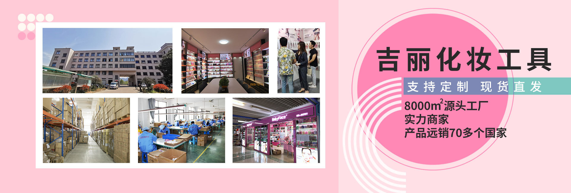 浦江吉麗化妝工具有限公司是一家集研發、設計、生產、加工、銷售為一體化妝刷生產企業,專業生產各類化妝毛刷、美容套刷、化妝工具、及粉撲。前身成立于2012年浦江雅姿化妝品有限公司,后因發展需要更名為浦江吉麗化妝用具有限公司,自有品牌RubyFace,工廠面積2500m2,員工55人,生產線12條,化妝刷月產量200萬支左右。 公司竭誠歡迎國內外客商來函來電洽談業務。