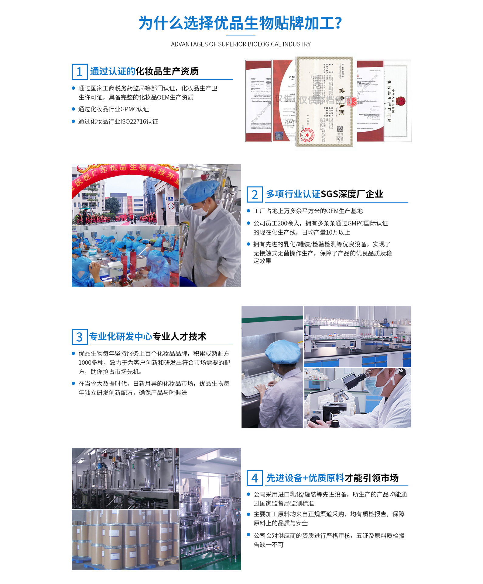工廠位于廣東省清遠市清城區廣清產業園創新路5號。優品集團引進國際先進的生產設備及優良的生產環境,搭建優質生產 線。采用Ro水質處理系統,達到藥水級水質,確保產品品質。 采用現代化的精密真空系統化機組,保障了產品的優良品質及穩定效果。自動灌裝生產線設備,實現了無接觸式無菌操作。 先進的檢測系統,凈化處理系統、消毒過濾系統,10萬級凈化無菌生產車間,多條生產線,體現超強的生產能力,日產量 可高達10萬支。