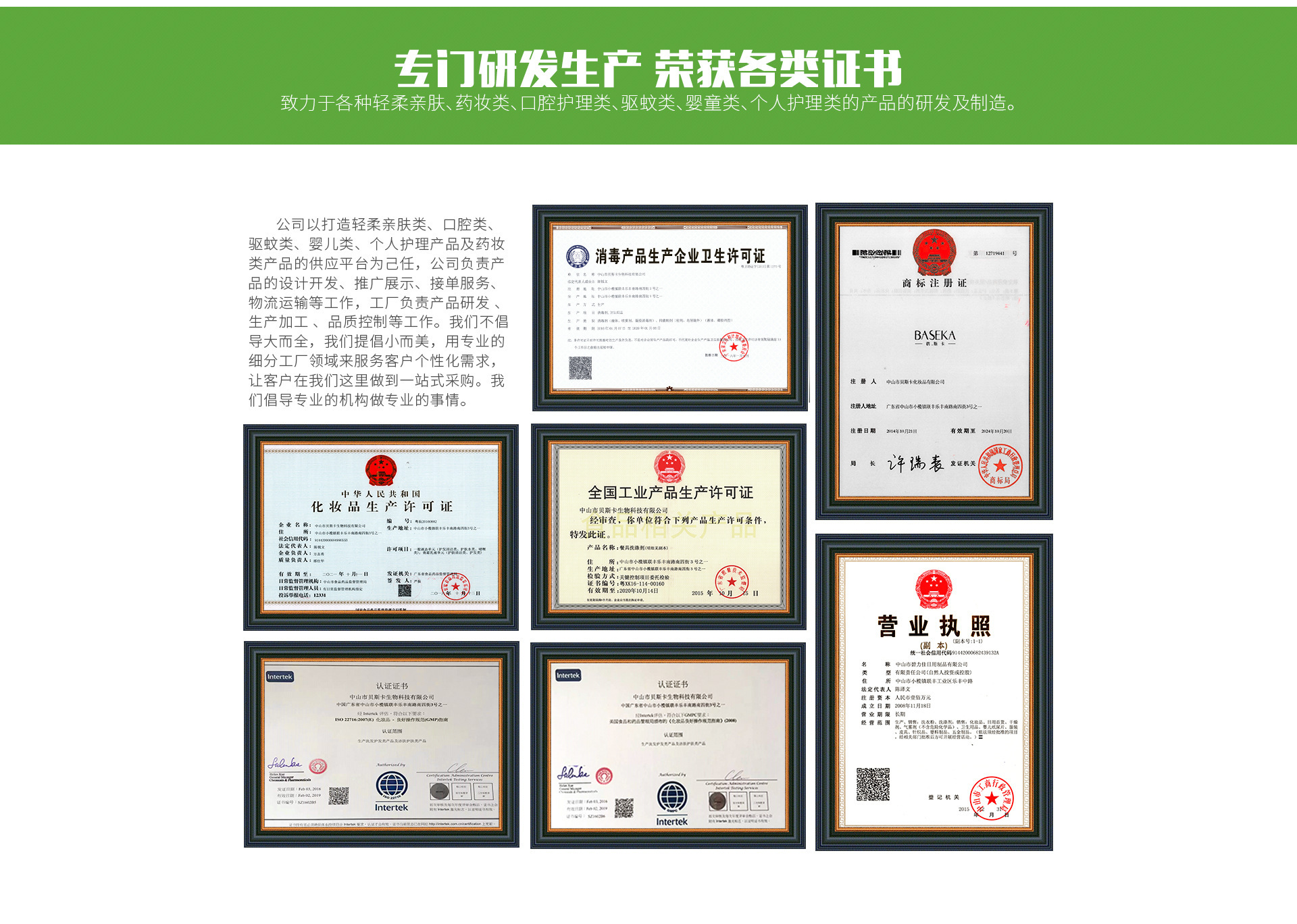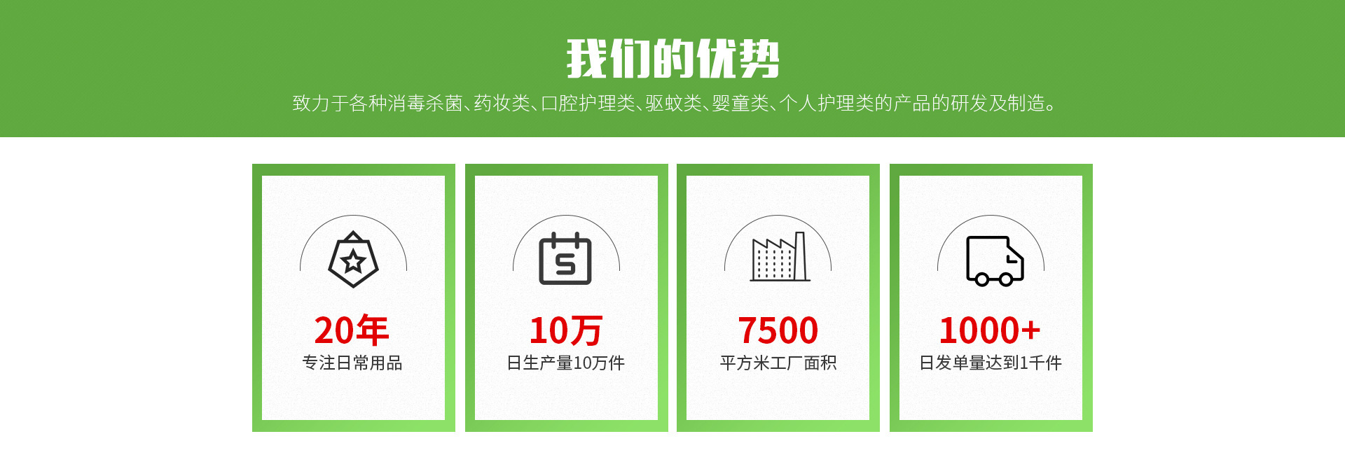 成立于1999年,創(chuàng)立至今已經(jīng)發(fā)展20年是一家集設(shè)計 、研發(fā) 、制造 、銷售服務(wù)為一體的專業(yè)的綜合性企業(yè)。致力于各種輕柔親膚、藥妝類、口腔護理類、驅(qū)蚊類、嬰童類、個人護理類的產(chǎn)品的研發(fā)及制造。