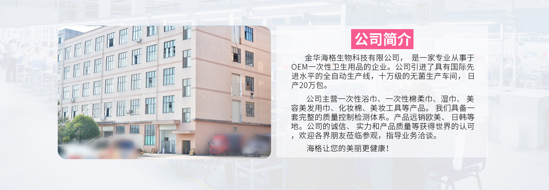 金華海格生物科技有限公司成立于2020年初,隸屬于海格企業,主要生產抽取式一次性洗臉巾,公司現有全自動生產線一條,半自動棉柔巾生產線一條。主要服務各類舔毛,京東等線上電商和商超類供應商。公司以優質的質量,良好的信用,至上的服務為基石求生存。歡迎各類客戶咨詢、合作。