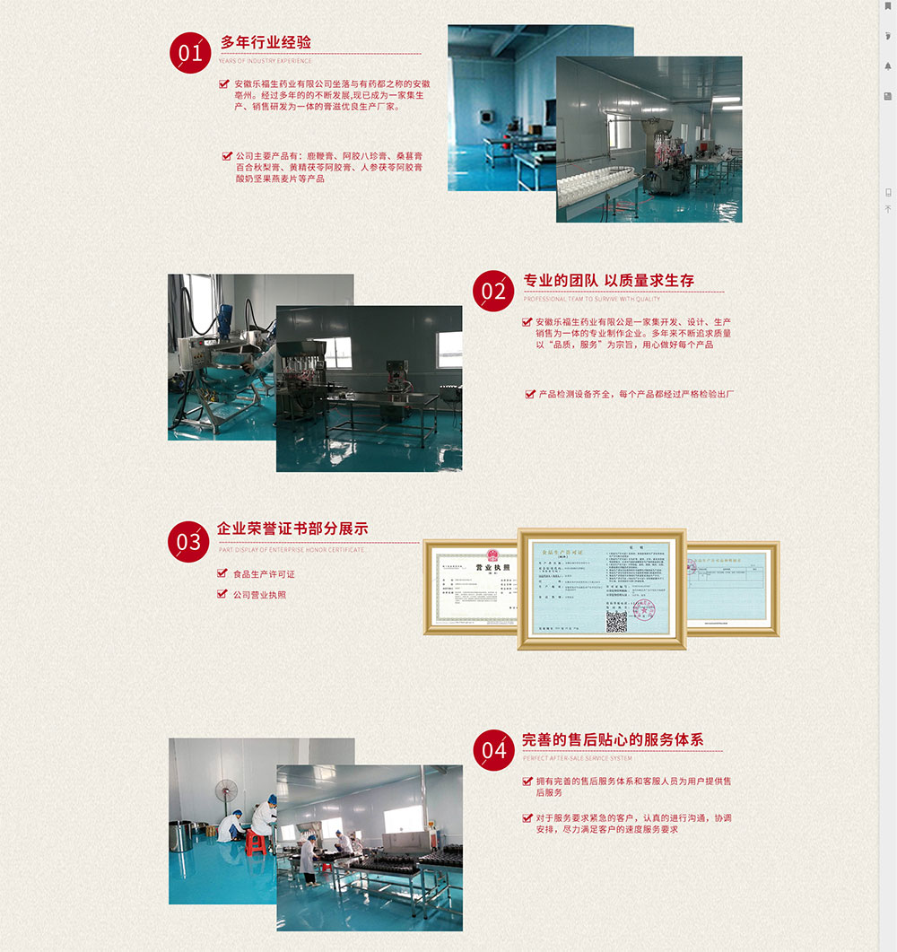 安徽樂福生藥業有限公司是鹿鞭膏、阿膠八珍膏、紅豆薏米茶、五寶茶、維生素、桑葚膏等膏滋類產品專業生產加工的公司,擁有完整、科學的質量管理體系。安徽樂福生藥業有限公司的誠信、實力和產品質量獲得業界的認可。歡迎各界朋友蒞臨參觀、指導和業務洽談。