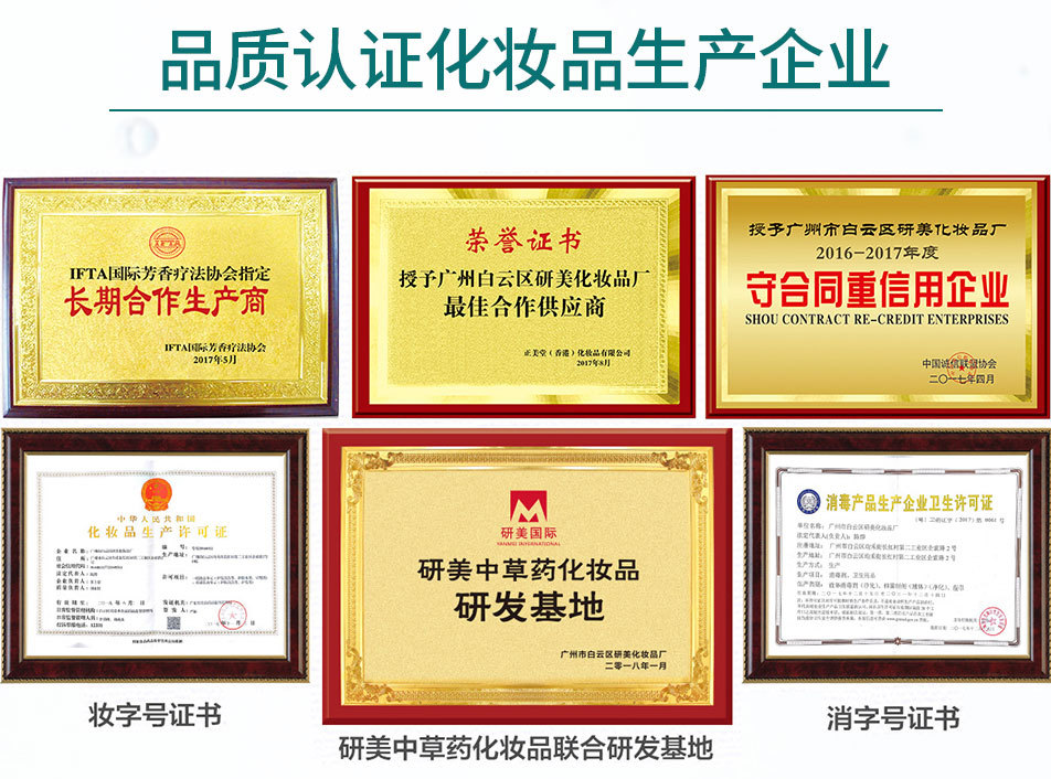 廣州市白云區研美化妝品廠由企業家陳昭武先生創建于2005年,位于廣州市白云區長紅村第二工業區。 工廠交通方便,距離白云機場、火車站均為 20 分鐘車程。 ● 研美化妝品OEM基地,建筑面積達2.5萬平方米,有19條現代化生產線、妝字號、消字號車間,符合GMPC標準, 有妝字號、消字號等化妝品生產許可及5個特證化妝品生產資質。 ● 工廠現有員工 300 人,其中研發檢測人員 15 人。工廠與原料供應商、設備商合作,并長期與科研院所進行合作, 開發和生產產品。 ● 工廠憑借研發、工藝、服務,獲得客戶的普遍尊重,已經與日化、電商企業建立了合作關系,是化妝品 OEM/ODM 的企業。 ● 研美一直堅持誠信經營、精益求精、品質的理念,憑借研發實力和生產能力,致力打造化妝品加工平臺,為客戶 提供增值服務