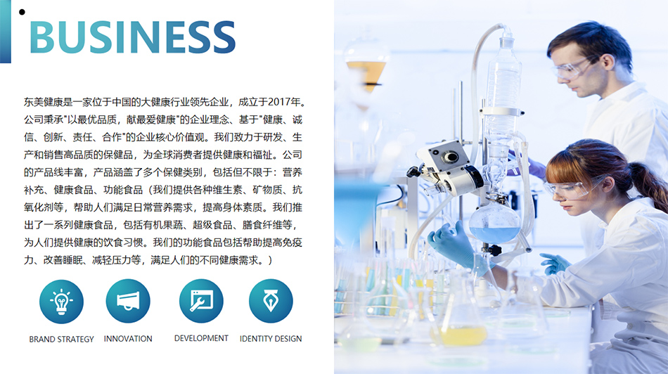東美健康是一家位于中國的大健康行業領先企業,成立于2017年。公司秉承"以最優品質,獻最愛健康"的企業理念、基于"健康、誠信、創新、責任、合作"的企業核心價值觀。我們致力于研發、生產和銷售高品質的保健品,為全球消費者提供健康和福祉。公司的產品線豐富,產品涵蓋了多個保健類別,包括但不限于:營養補充、健康食品、功能食品,我們提供各種維生素、礦物質、抗氧化劑等,幫助人們滿足日常營養需求,提高身體素質。我們推出了一系列健康食品,包括有機果蔬、超級食品、膳食纖維等,為人們提供健康的飲食習慣,滿足人們的不同健康需求。