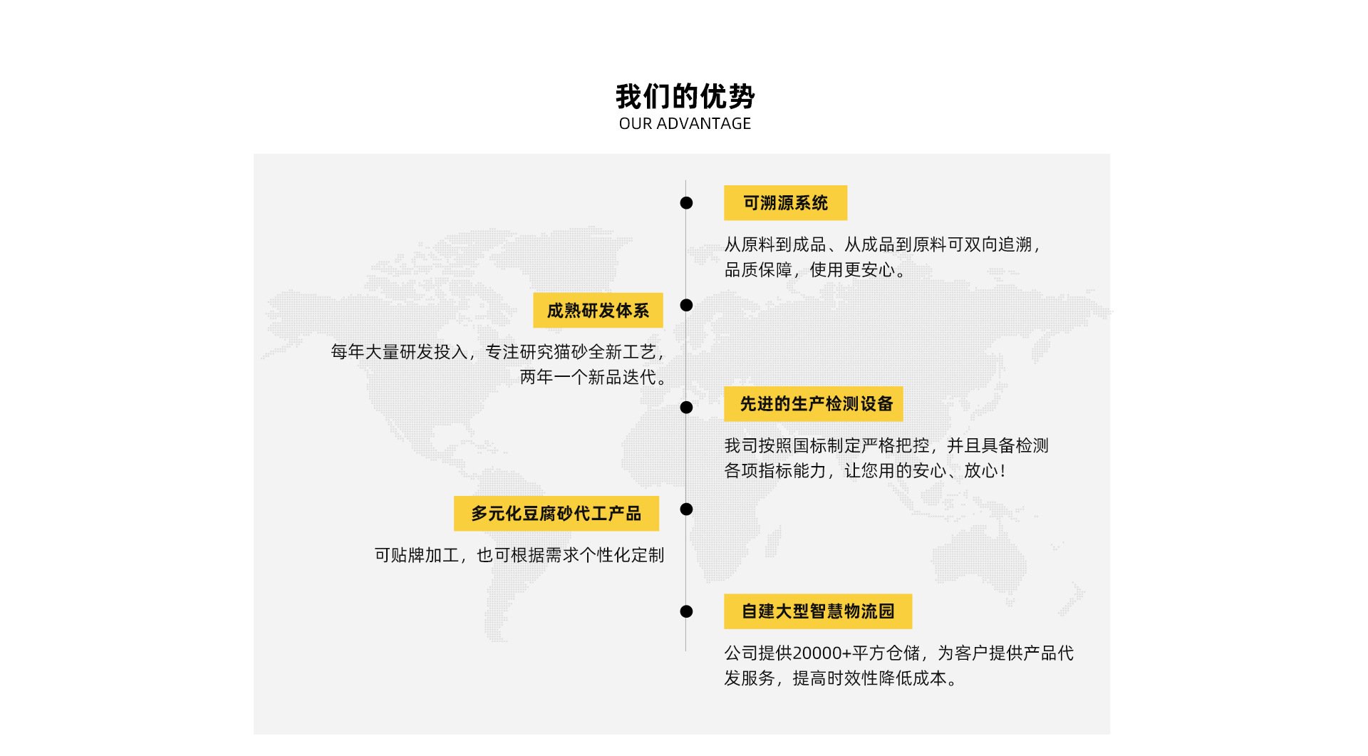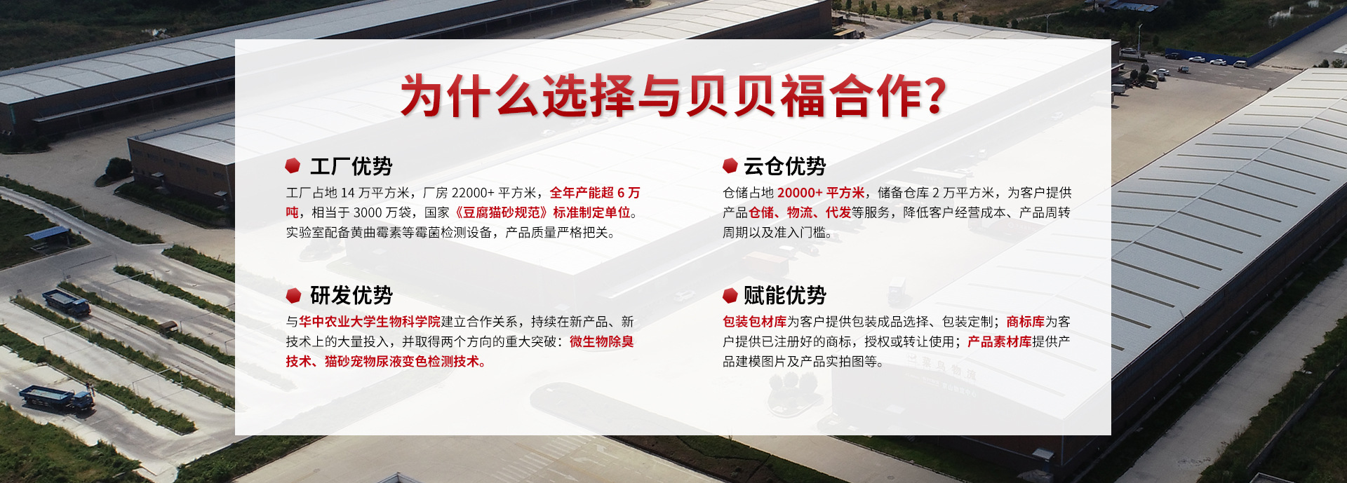 湖北貝貝福寵物用品有限公司坐落湖北省京山市經濟技術開發區,工廠占地14萬平方米,廠房22000多平方米,倉儲15000多平方米。主要從事寵物用品的生產與銷售,目前的主要產品是以天然植物為原料,生產有:豆腐貓砂、綠茶貓砂、活性炭貓砂、豆腐混合貓砂等。 貝貝福是貓砂行業檢測標準制定者。擁有先進的自動配料、造粒、烘干、真空包裝等全套牧羊設備,豆腐貓砂的年產能達到60000噸。 2020年6月19日,中國出入境檢驗檢疫協會寵物產業標準化技術委員會舉行《豆腐貓砂規范》團體標準研討會,湖北貝貝福作為發起單位應邀入會!我司具有檢測曲黃霉素B1、霉菌毒素、甲醛、重金屬等污染項目的能力,為共同推進寵物行業標準化制定的進程做出應有的貢獻。