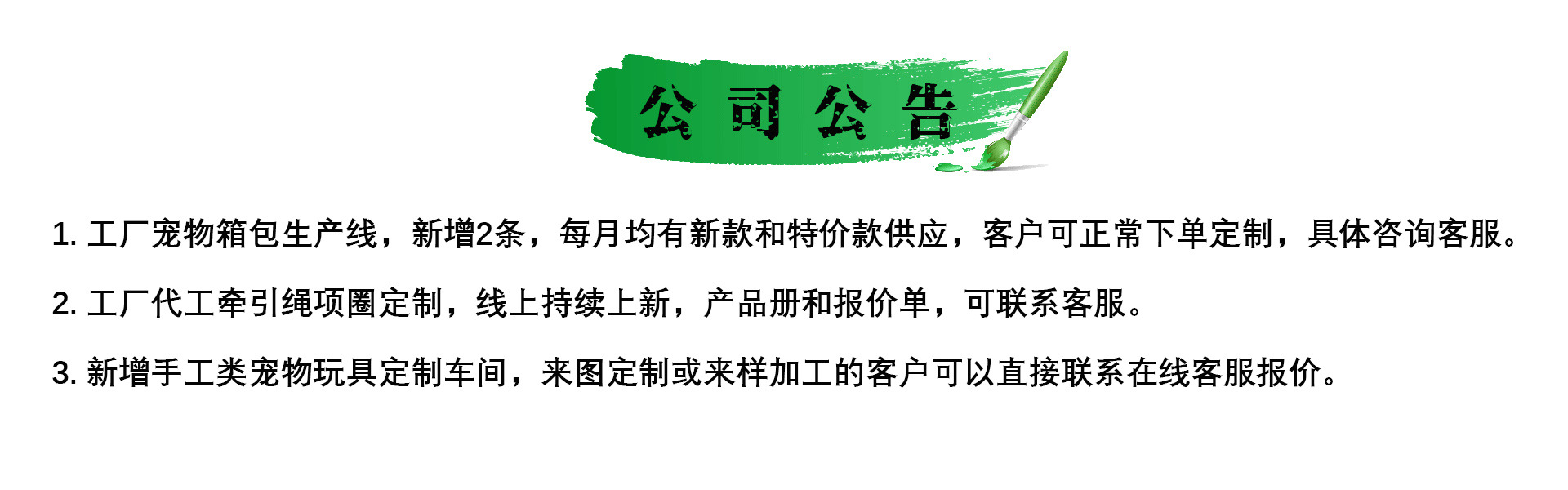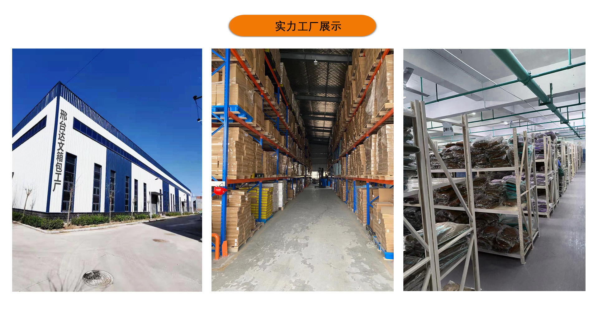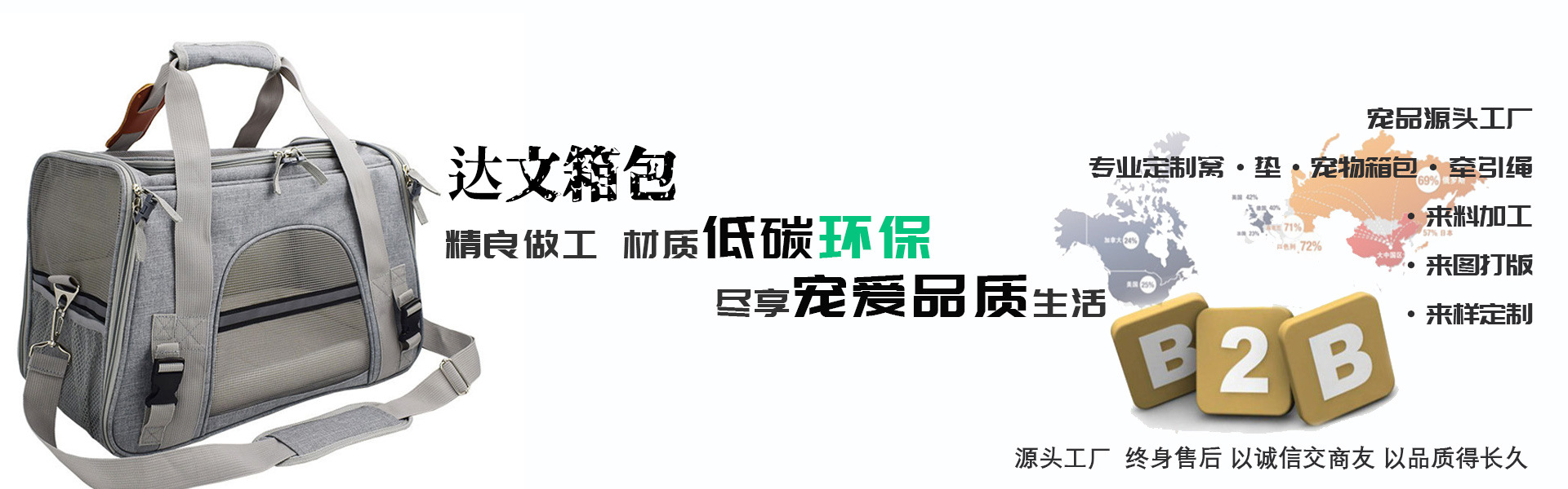達文箱包生產工廠成立于2015年10月01日,我們是一家集自主設計加工生產于一體的工廠,生產加工各種寵物包、窩墊、牽引繩、項圈、玩具等寵物類產品,有多年的接單加工生產經驗。接受打版出樣,來圖生產,供料加工等。我們有4個生產車間和110個工人。質量和交期您完全可以放心。“誠信才可長久”是我們工廠的理念。誠邀您的合作。
