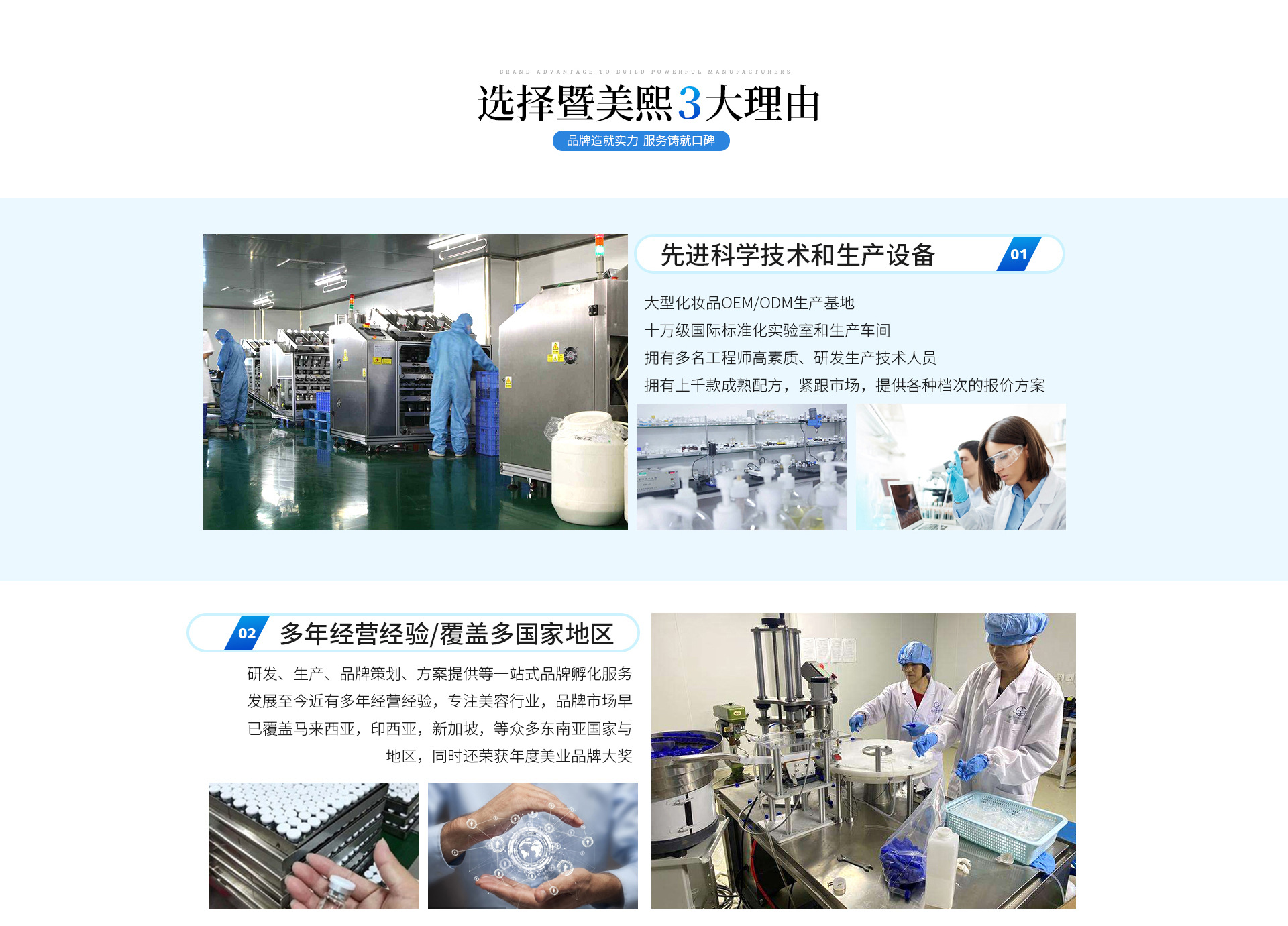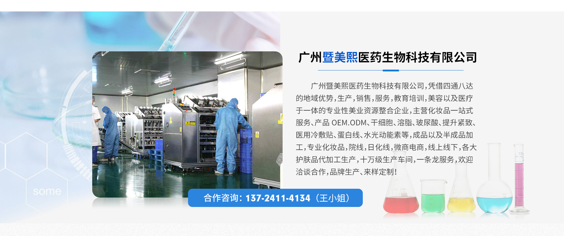 廣州暨美熙醫(yī)藥生物科技有限公司,憑借四通八達(dá)的地域優(yōu)勢(shì),生產(chǎn),銷售,服務(wù),教育培訓(xùn),美容以及醫(yī)療于一體的專業(yè)性美業(yè)資源整合企業(yè), 主營(yíng)化妝品一站式服務(wù)、產(chǎn)品OEM.ODM、干細(xì)胞、溶脂、玻尿酸、提升緊致、醫(yī)用冷敷貼、蛋白線、水光動(dòng)能素等,成品以及半成品加工,專業(yè)化妝品,院線,日化線,微商電商,線上線下, 各大護(hù)膚品代加工生產(chǎn),十萬(wàn)級(jí)生產(chǎn)車間,一條龍服務(wù),歡迎洽談合作,品牌生產(chǎn)、來(lái)樣定制! 發(fā)展至今近有多年經(jīng)營(yíng)經(jīng)驗(yàn)。專注全球美容行業(yè),品牌市場(chǎng)早已覆蓋馬來(lái)西亞,印西亞,新加坡,等眾多東南亞國(guó)家與地區(qū),同時(shí)還榮獲年度美業(yè)品牌大獎(jiǎng)。 產(chǎn)品已遠(yuǎn)銷全國(guó)三十多個(gè)省。一直以來(lái),公司始終將研發(fā)放在首位,強(qiáng)勢(shì)引進(jìn)韓國(guó)領(lǐng)先美容技術(shù),堅(jiān)持以創(chuàng)新為靈魂,不斷優(yōu)化提升產(chǎn)品品質(zhì), 為廣大客戶帶去日新月異的使用體驗(yàn)。 公司旗下各大職能部門通力協(xié)作,各司其職,依托科學(xué)完善的管理制度,專業(yè)的研
