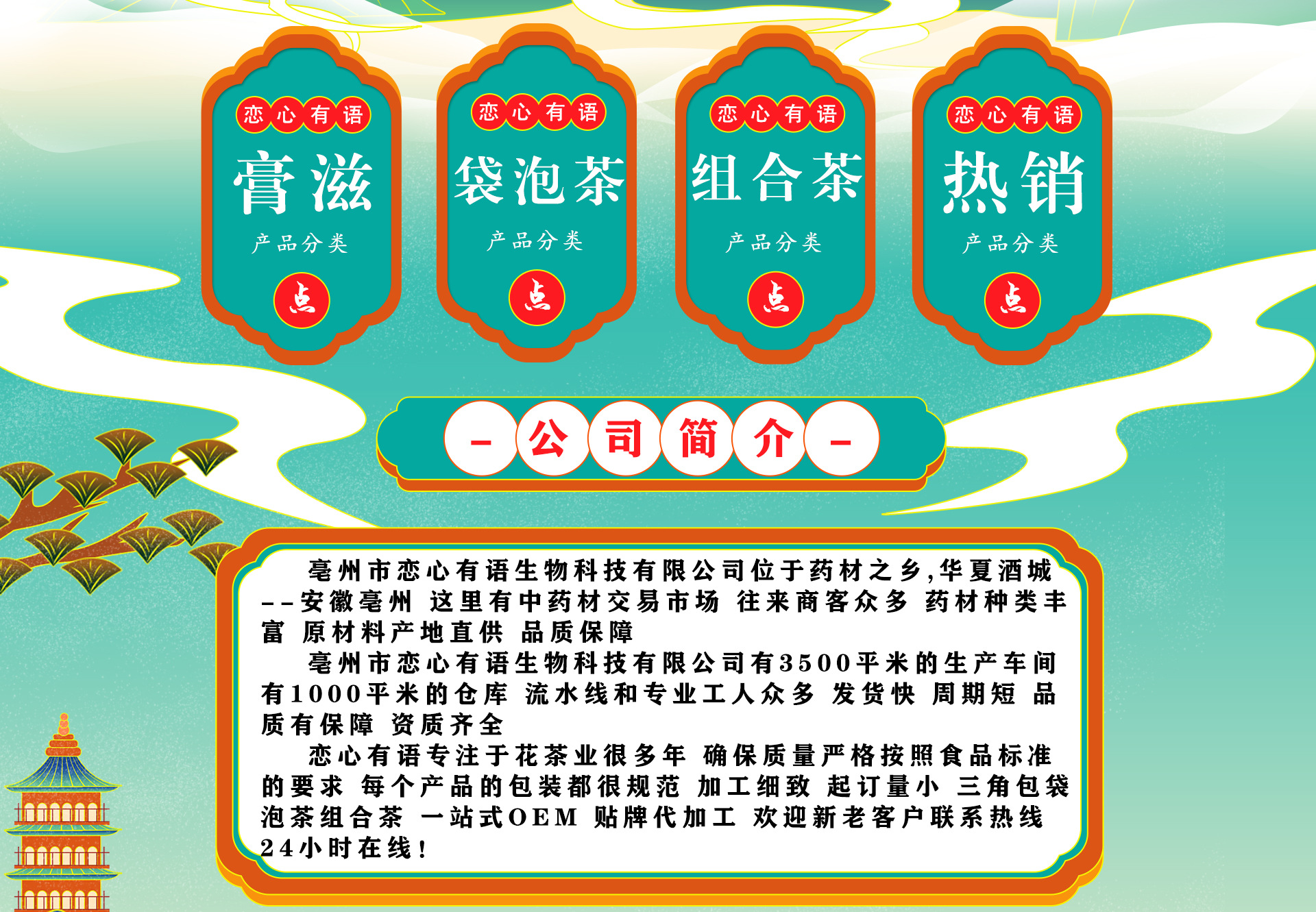 亳州市戀心有語生物科技有限公司是花茶、膏滋、黑芝麻丸、代餐粉等產(chǎn)品專業(yè)生產(chǎn)加工的公司,擁有完整、科學(xué)的質(zhì)量管理體系。亳州市戀心有語生物科技有限公司的誠信、實力和產(chǎn)品質(zhì)量獲得業(yè)界的認可。歡迎各界朋友蒞臨參觀、指導(dǎo)和業(yè)務(wù)洽談。