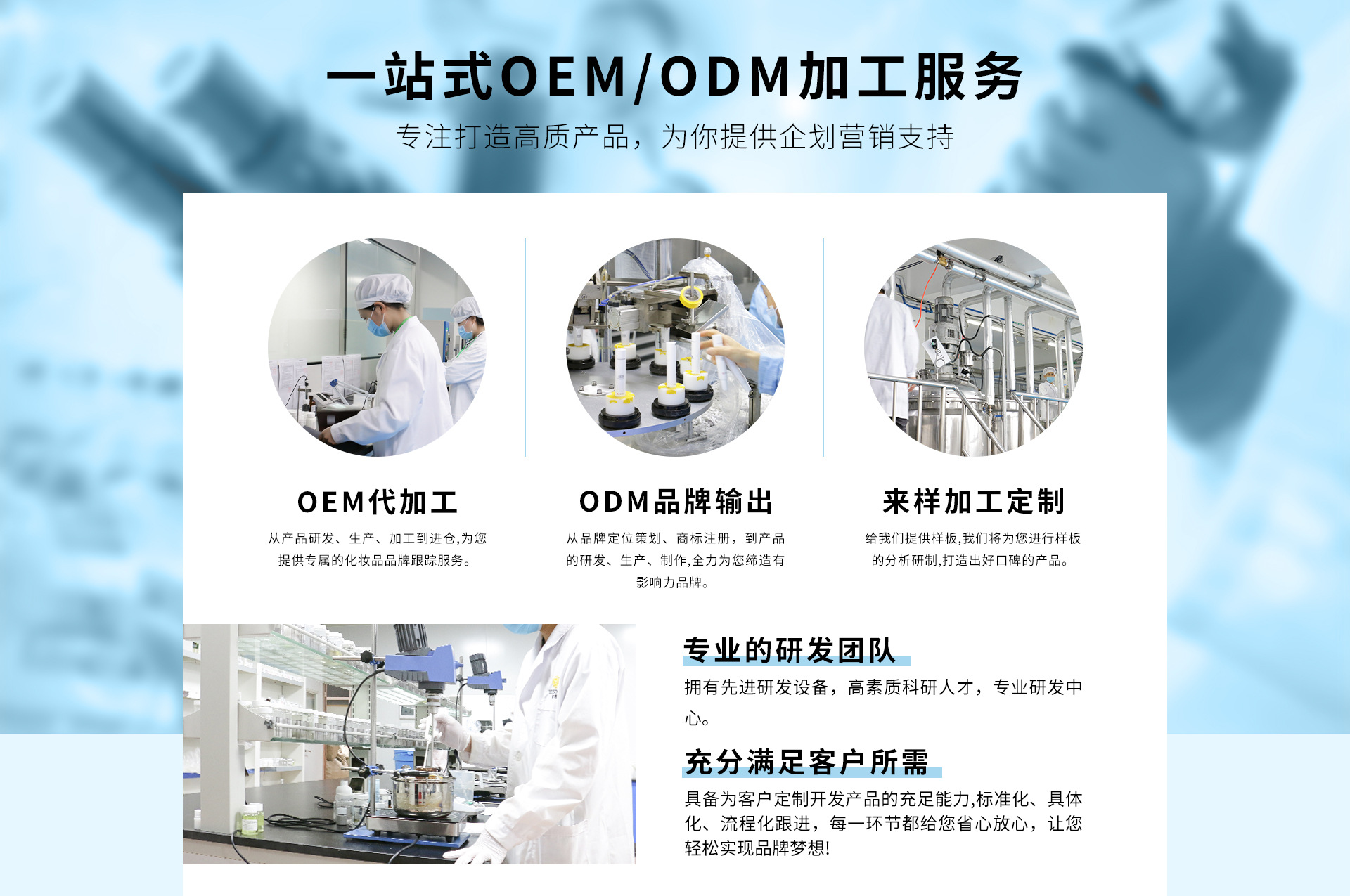 廣州市渝崧精細化工有限公司擁有自己的獨立生產線,是集研發、制造、營銷服務于一體的精細化OEM/ODM多方位加工制造生產型工廠。本著提供安全高效優質產品的理念嚴格按照GMP標準化建設生產,遵循ISO9001質量管理體系生產運營,打造制藥級別的國際一線生產車間。耗資干萬引入的先進乳化生產設備和13條自動化生產流水線,及國內外領先的自動灌裝、試驗、殺菌、檢測儀器等高新設備,積累了豐富的生產經驗和科學的配方技術能力,目前已獲得十多項國家認證的獨家研發生產專利證書。渝崧集團配備專業研發團隊并擁有5000多款成熟配方,且與國內醫學博士、皮膚學專家、免疫學專家、細胞學專家、藥劑師、及生物化學專家共同進行產品的研發創新,嚴格把控原料、搭配配方,每個產品融入數十年的專利技術和科技配方,更精準高效。護膚品OEM/ODM