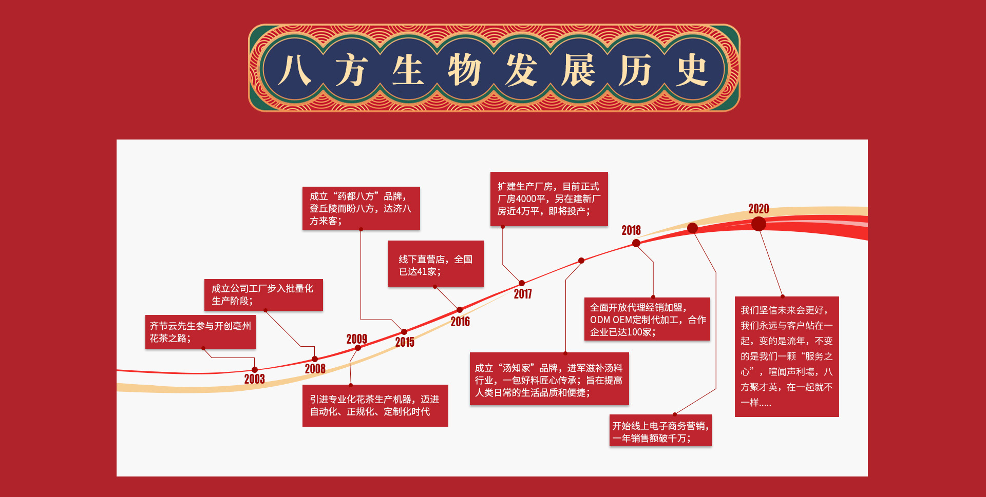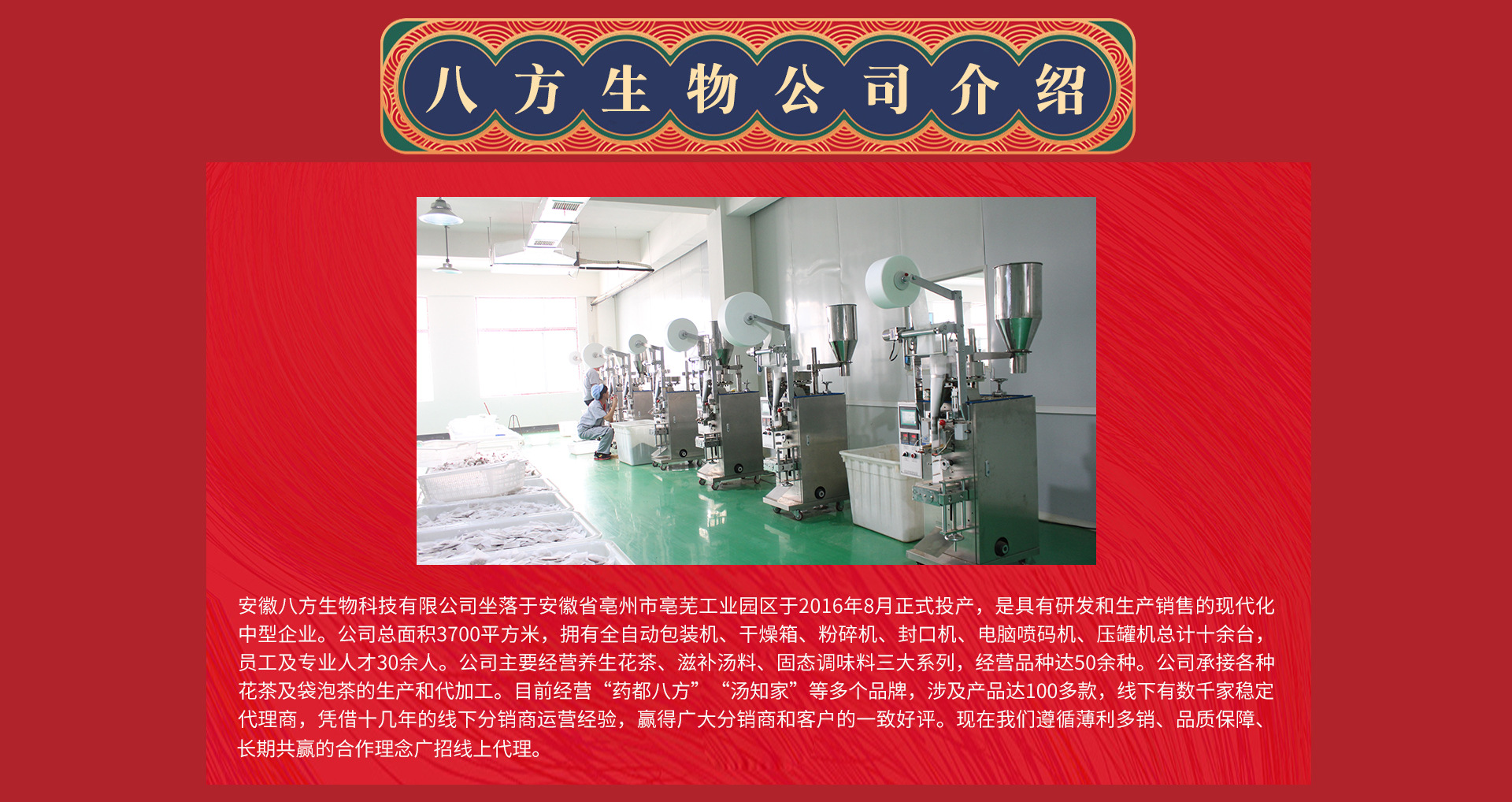 安徽八方生物科技有限公司成立于2016年5月,注冊(cè)資本2000萬(wàn)元。公司坐落于安徽省亳州市亳蕪現(xiàn)代產(chǎn)業(yè)園區(qū)。總建筑面積3700平方米。是一家集“資源、人才、技術(shù)、管理”于一體的專(zhuān)業(yè)從事代用茶、調(diào)味料的研發(fā)和生產(chǎn)銷(xiāo)售的現(xiàn)代化中小型企業(yè)。公司現(xiàn)有員工30多人,其中,具有大中專(zhuān)畢業(yè)學(xué)歷人員達(dá)40%以上。 我公司于2016年8月正式投產(chǎn),公司擁有全自動(dòng)包裝流水線等先進(jìn)的生產(chǎn)設(shè)備,能夠滿(mǎn)足市場(chǎng)大部分花茶等產(chǎn)品的包裝規(guī)格和客戶(hù)需求。產(chǎn)品有養(yǎng)生花茶、滋補(bǔ)湯料、固態(tài)調(diào)味料三大系列,共50多個(gè)品種,產(chǎn)品在同行業(yè)及國(guó)內(nèi)市場(chǎng)都享有較高聲譽(yù)。同時(shí),公司還承接各種花茶及袋泡茶的生產(chǎn)和代加工。我公司秉承“質(zhì)量為本,勇于創(chuàng)新”的發(fā)展理念,依托地域優(yōu)勢(shì),堅(jiān)持優(yōu)質(zhì)原料購(gòu)進(jìn),手工精挑細(xì)選,科學(xué)配比加工。
