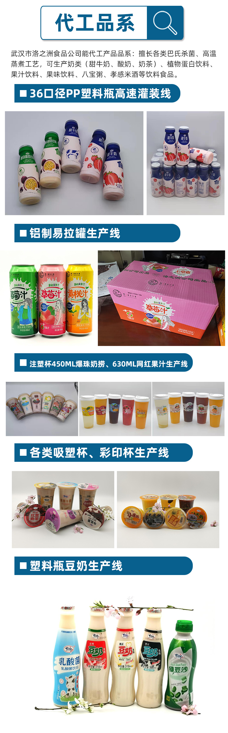 本公司地處國家級食品產業園區,占地10000平方米,建設有現代化精良的廠房,購置有先進的食品生產設備,配備有完備的殺菌、發酵、冷卻等配套設施,十萬級的空氣凈化生產車間,可以滿足多品種各類別的食品飲料的代加工生產。本公司有著十幾年生產食品飲料的生產經驗,培養了一批富有責任心、經驗豐富的管理人員和兢兢業業的熟練工人,建立有完善的管理制度。目前我們公司可以代加工的產品有: