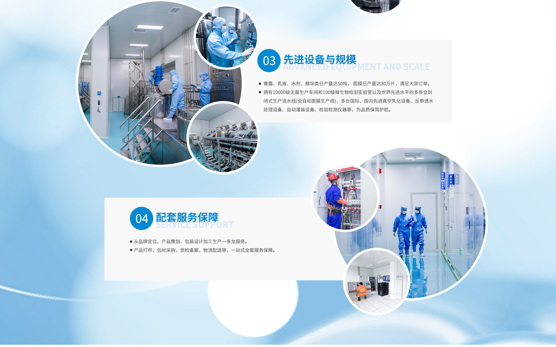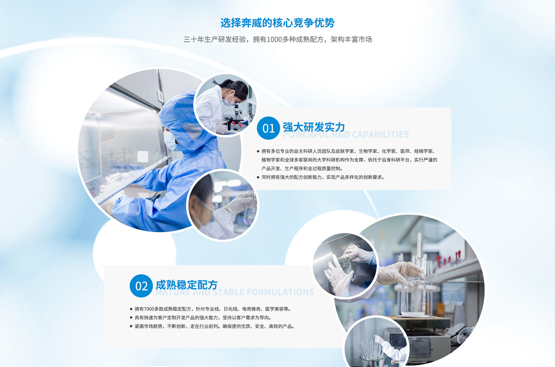 四川奔威智創(chuàng)生物科技有限公司是一家集研發(fā)、生產(chǎn)、銷售、服務(wù)為一體的企業(yè),其前身是成都市青羊區(qū)精細(xì)化工廠,公司擁有30余年專業(yè)化妝品、消毒產(chǎn)品OEM/ODM生產(chǎn)管理等經(jīng)驗(yàn),成就了眾多知名品牌。自1989年建廠以來,一直以“雕琢卓越品質(zhì),鑄創(chuàng)世界品牌”為質(zhì)量方針。 工廠按GMPC全封閉無菌標(biāo)準(zhǔn)建設(shè),擁有10000級無菌生產(chǎn)車間和100級微生物檢測實(shí)驗(yàn)室。以及世界先進(jìn)水平的多條全封閉式生產(chǎn)流水線(全自動面膜生產(chǎn)線),多臺國際、國內(nèi)先進(jìn)乳化設(shè)備、自動灌裝設(shè)備、檢驗(yàn)檢測儀器等。 目前公司已擁有多位專業(yè)的自主科研人員團(tuán)隊(duì)及皮膚學(xué)家、生物學(xué)家、化學(xué)家、醫(yī)師、植物學(xué)家作為支撐,與四川大學(xué)華西學(xué)院、國家藥材股份有限公司、成都中醫(yī)大學(xué)、重慶三軍醫(yī)大學(xué)、北京協(xié)和醫(yī)院等知名校企建立了緊密的技術(shù)研發(fā)合作。 公司還擁有強(qiáng)大的配方創(chuàng)新力。成熟配方千余個,幾乎能滿足市場上熱銷產(chǎn)品的個性化定制。實(shí)現(xiàn)產(chǎn)品多樣化的創(chuàng)新要求