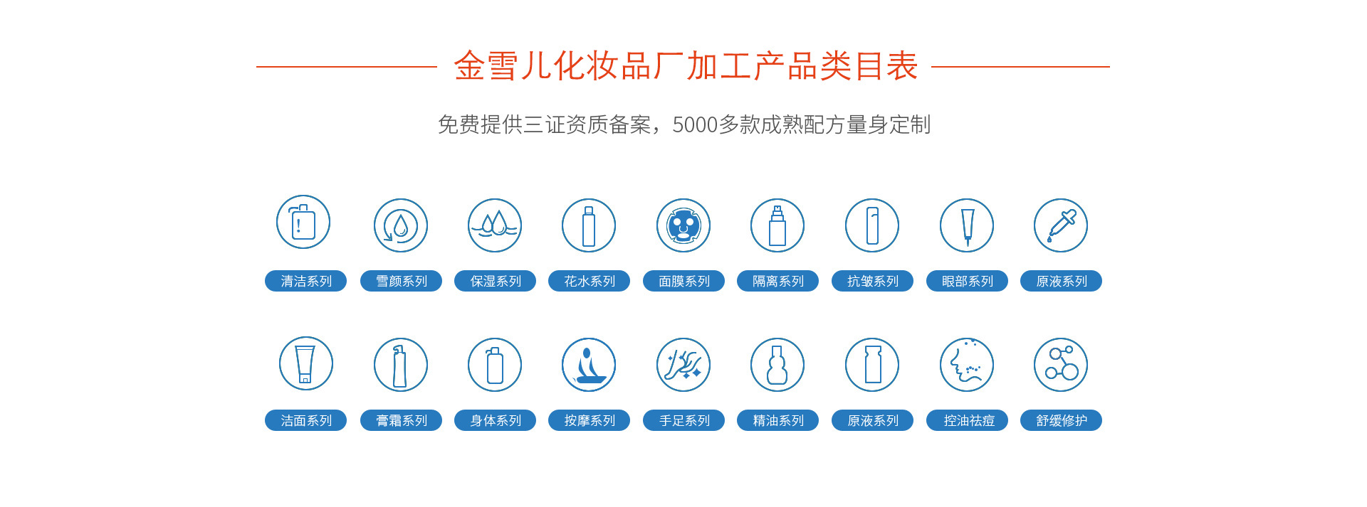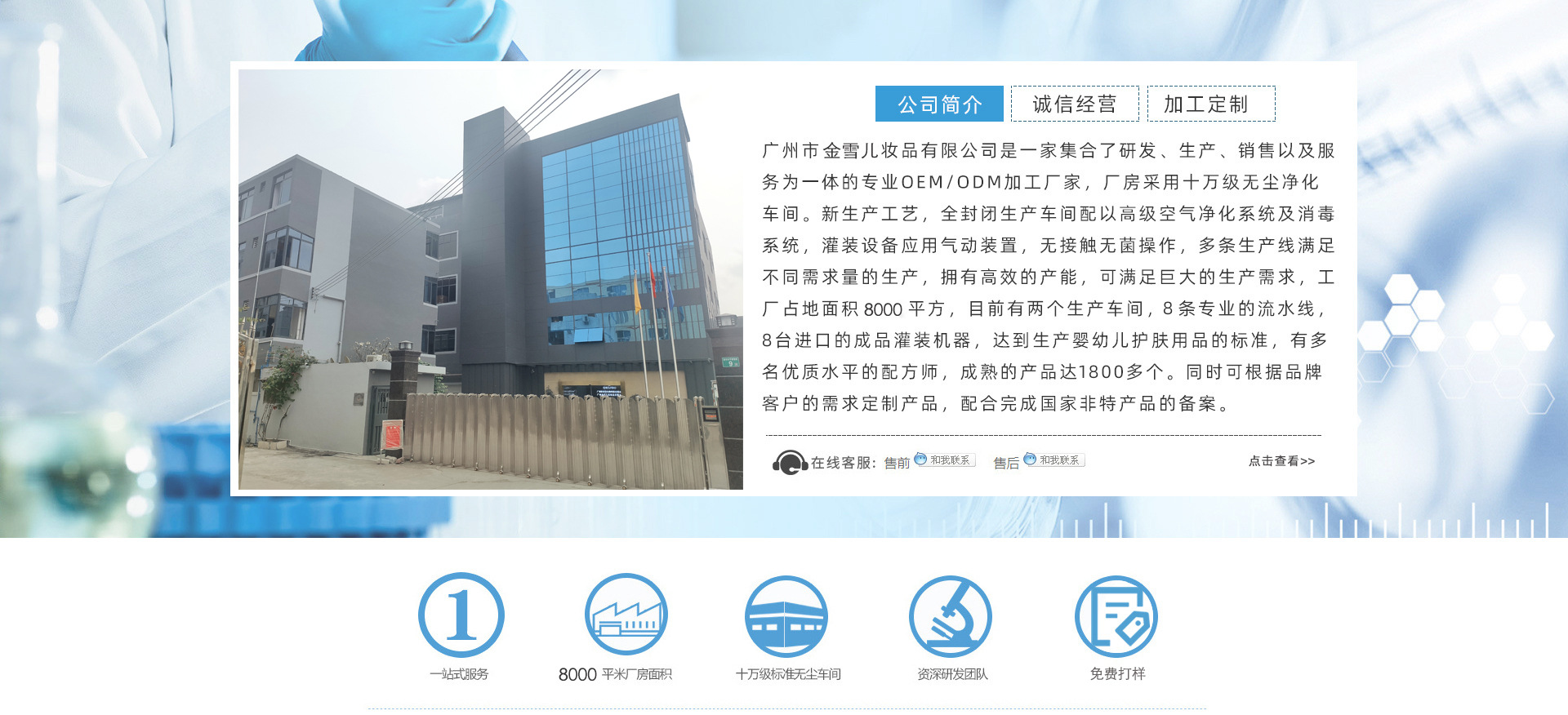 廣州金雪兒化妝品有限公司是一家集美容護(hù)膚養(yǎng)顏品牌加工、研發(fā)、生產(chǎn)、銷售為一體的專業(yè)企業(yè)。擁有生產(chǎn)相關(guān)區(qū)域近8000平方的10萬級凈化標(biāo)準(zhǔn)工廠,有多條現(xiàn)代化的生產(chǎn)線,先進(jìn)的乳化、灌包裝、檢驗及研發(fā)設(shè)備; 目前已申請GMPC認(rèn)證, 已完成二合一新證換領(lǐng)工作; 我們以完善的檢驗手段, 嚴(yán)謹(jǐn)?shù)难芯块_發(fā)體系和強(qiáng)大的生產(chǎn)能力為客戶提供全方位、個性化OEM/ODM/OBM/OCM服務(wù), 持續(xù)改進(jìn)的質(zhì)量管理體系,確保安全有效的產(chǎn)品供應(yīng)滿足客戶需求,現(xiàn)已在行業(yè)內(nèi)形成良好的口碑;公司堅持以產(chǎn)品的安全、穩(wěn)定為第一要務(wù),以對顧客對社會高度負(fù)責(zé)任的態(tài)度踐行品質(zhì)第一、服務(wù)至上的經(jīng)營理念。