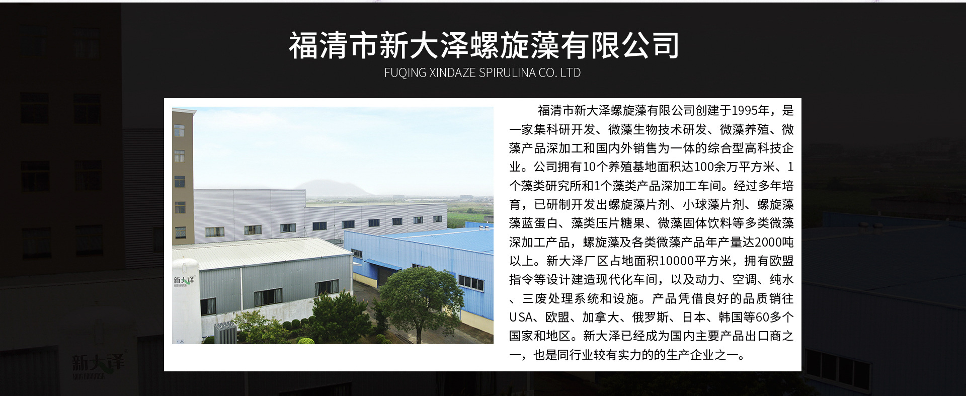 福清市新大澤螺旋藻有限公司創(chuàng)建于1995年,是一家集科研開發(fā)、微藻生物技術(shù)研發(fā)、微藻養(yǎng)殖、微藻產(chǎn)品深加工和國內(nèi)外銷售為一體的綜合型高科技企業(yè)。公司擁有7個養(yǎng)殖基地面積達100余萬平方米、1個藻類研究所和1個藻類產(chǎn)品深加工車間。經(jīng)過多年培育,已研制開發(fā)出螺旋藻片劑、小球藻片劑、螺旋藻藻藍蛋白、藻類壓片糖果、微藻固體飲料等多類微藻深加工產(chǎn)品,螺旋藻及各類微藻產(chǎn)品年產(chǎn)量達2000噸以上。 新大澤廠區(qū)占地面積10000平方米,擁有按照國家GMP標準、歐盟指令等設(shè)計建造現(xiàn)代化車間,以及動力、空調(diào)、純水、三廢處理系統(tǒng)和設(shè)施。全套生產(chǎn)工藝擁有自動化雙層篩粉、螺帶混合、全自動高速壓片、全自動膠囊充填、自動包裝、激光噴碼機等先進設(shè)備。2010年起通過ISO9001等一系列質(zhì)量體系認證和GMP標準車間認證。