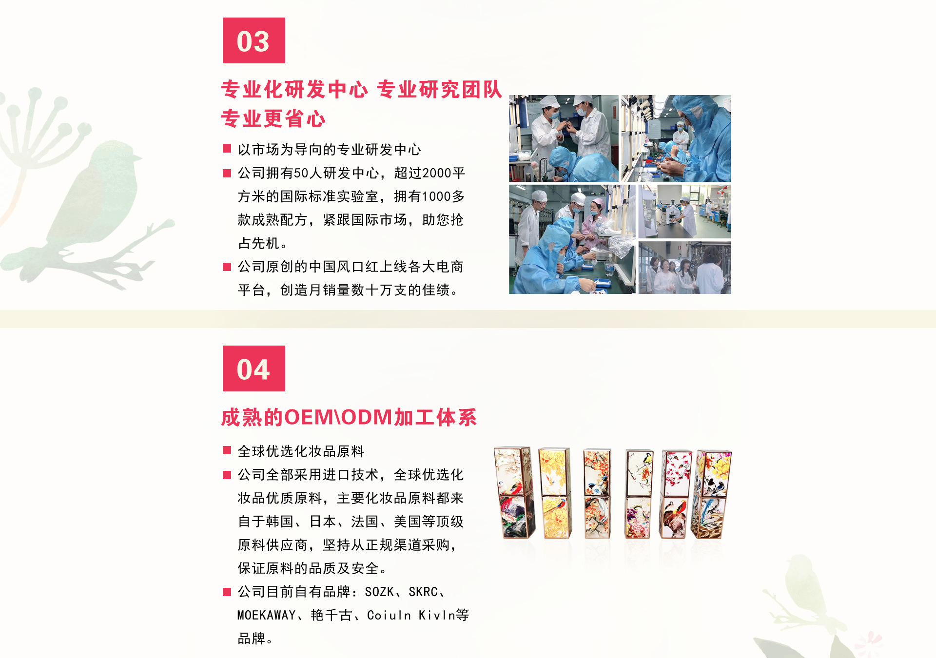 1、 通過國家工商稅務食藥監等部門認證,化妝品生產衛生許可證,具備完整的化妝品OEM生產資質。 2、 廣州嬌寶兒化妝品有限公司屬下擁有三家子公司,兩家兄弟工廠,工廠總占地面積約十余萬平方米的OEM生產基地。 公司員工300余人,擁有高科技現代化生產線,日產口紅產口10萬支。 超過2000平方米的國際標準實驗室。 3、 專業化的以市場為導向的專業研發中心 公司擁有50人研發中心,擁有1000多款成熟配方,緊跟國際市場,助您搶占先機 公司原創的中國風口紅上線各大電商平臺,創造月銷量數十萬支的佳績。 4、全球優選化妝品原料 公司全部采用進口技術,全球優選化妝品優質原料,主要化妝品原料都來自于韓國、日本、法國、美國等頂級原料供應商,堅持從正規渠道采購,保證原料的品質及安全。 公司目前自有品牌:SOZK、SKRC、MOEKAWAY、艷千古、Coiuln Kivln等品牌