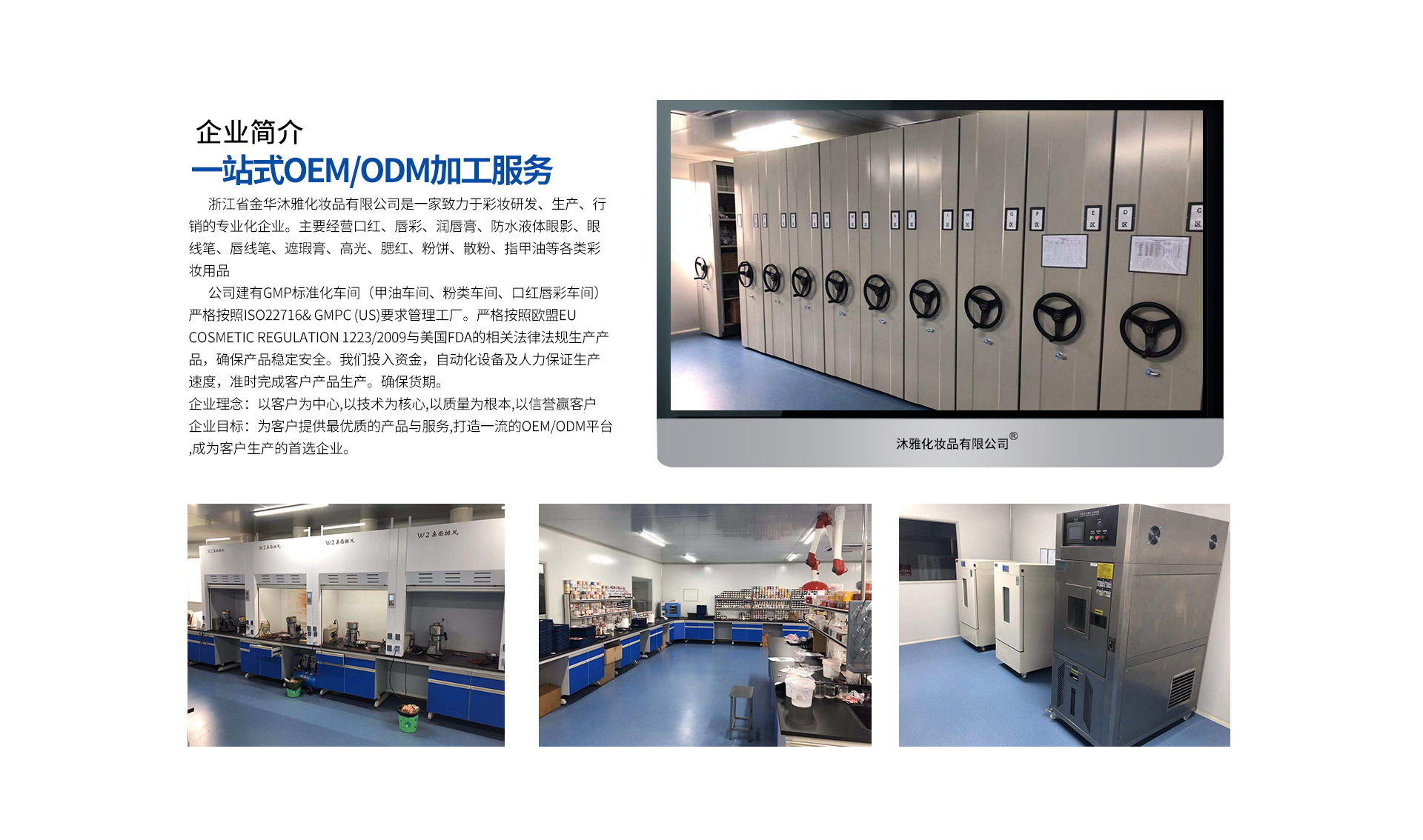 金華沐雅化妝品有限公司是化妝品、彩妝、護膚品等產品專業生產加工的公司,擁有完整、科學的質量管理體系。金華沐雅化妝品有限公司的誠信、實力和產品質量獲得業界的認可。歡迎各界朋友蒞臨參觀、指導和業務洽談。