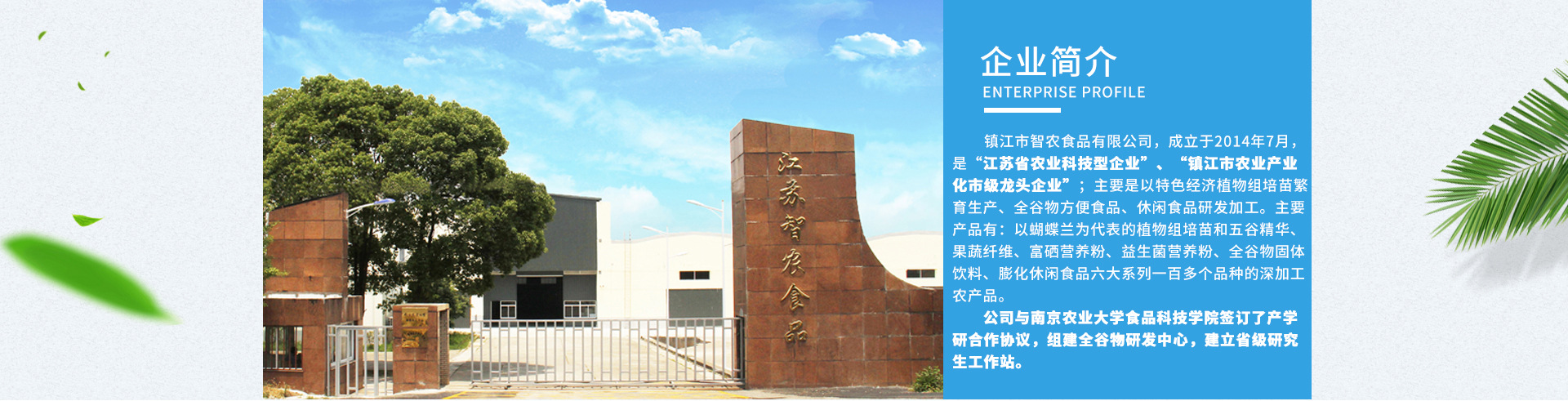 鎮(zhèn)江市智農(nóng)食品有限公司,江蘇省農(nóng)業(yè)科技型企業(yè),鎮(zhèn)江市農(nóng)業(yè)產(chǎn)業(yè)化龍頭企業(yè),成立于2013年7月,坐落于鎮(zhèn)江市丹徒區(qū)經(jīng)濟(jì)開(kāi)發(fā)區(qū),占地面積18000平方米。公司經(jīng)過(guò)6年的發(fā)展,形成了集特色蔬菜、花卉繁育生產(chǎn)、全谷物和畜禽方便休閑食品研發(fā)與加工和電子商務(wù)為一體的綜合型科技企業(yè)。依托南京農(nóng)業(yè)大學(xué)為技術(shù)平臺(tái),與南京農(nóng)業(yè)大學(xué)食品科技學(xué)院簽訂了產(chǎn)學(xué)研合作戰(zhàn)略框架協(xié)議,進(jìn)行全面的人才培養(yǎng)、技術(shù)革新和新產(chǎn)品研發(fā)合作,組建了“南農(nóng)-智農(nóng)全谷物研發(fā)中心”,建立了江蘇省企業(yè)研究生工作站,為新產(chǎn)品的研發(fā)以及產(chǎn)品的質(zhì)量控制提供了技術(shù)保障。 公司始終堅(jiān)持“五谷為本,崇尚自然之源”的經(jīng)營(yíng)理念,“堅(jiān)持、責(zé)任、敬業(yè)、科技、品牌”的服務(wù)宗旨,為客戶提供健康、美味、安全的食品。