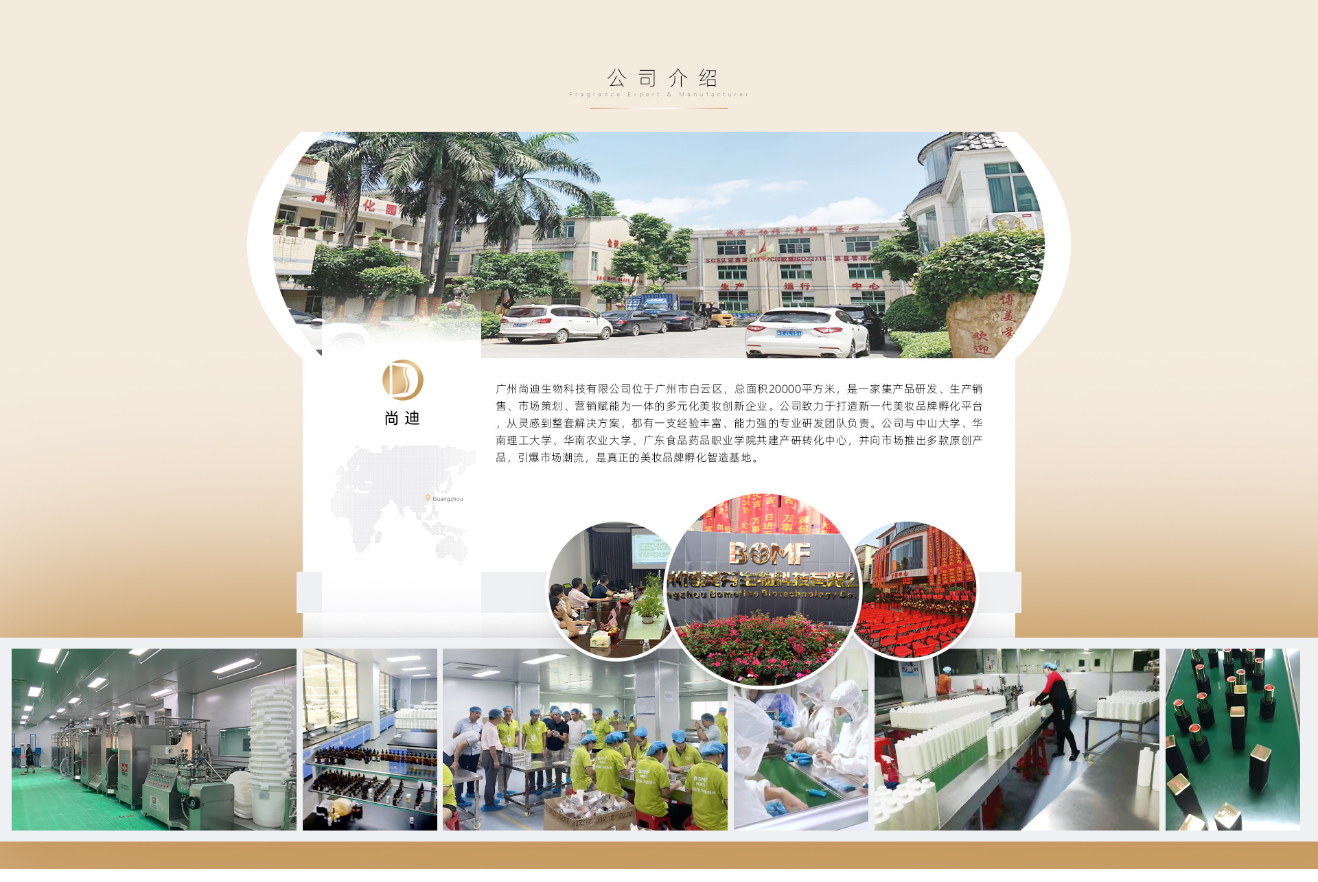 時尚創新,集成共享-廣州尚迪生物科技有限公司自創立伊始就一直以此為信念以專業的技能,獨到的眼光,專注于美妝,美容行業,執雄厚的技術執行能力,打造集:技術開發,產品創新,生產管理,培訓展示為一體的時尚創新中心,立志為國內外客戶和消費者提供高品質的產品和完善的服務,做一流的OEM/ODM,共享優質時尚牛活。 公司地處中國的南大門羊城廣州,產品研發及展示中心位于廣州市白云區中心地區環境優美交通便利。熱誠歡迎各方有志之士,攜手發展時尚美業,共創美好明天。