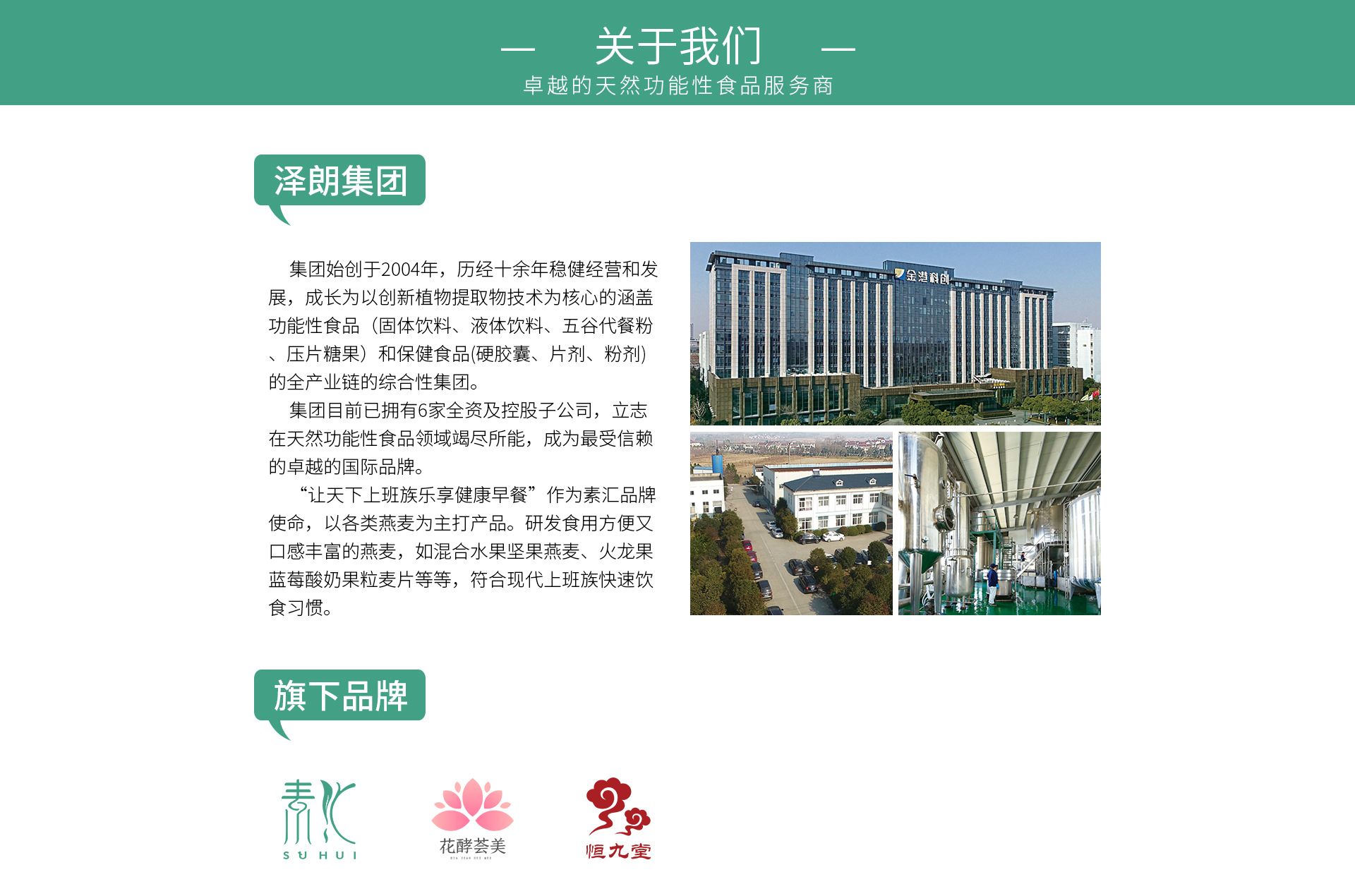 江蘇澤朗醫藥科技集團2004年靠承接研發及專利技術轉化白手起家,經歷16年不斷創新優化,風雨兼程,現已發展成為一家集科研、制造、市場全產業鏈的公司,占地22000平方米,員工百名,建有綜合辦公樓,食用動、植物提取物生產線,固體飲料生產線、壓片糖果生產線,液體飲料生產線,方便食品生產線,通過了SC生產許可認證,生產設備齊全,可完成中試及大生產各生產流程。