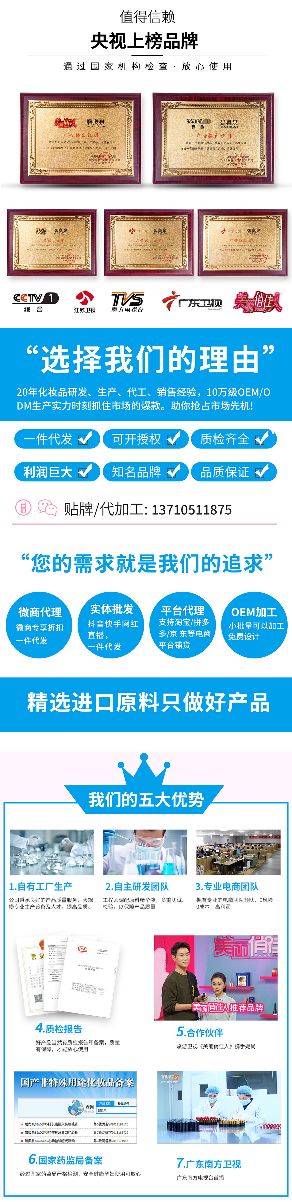 我司是化妝品生產大企業,專業從事化妝品研發,生產,加工,銷售,品質保證,精湛的技術與嚴格的管理技術,一直深受市場的高度認可。直供品牌直播爆款、分銷代理、批發,貼牌代加工,OEM,ODM,化妝品彩妝、護膚生產,有需要 代加工貼牌生產的 請加公司V X,電話同步18926178977。朋友圈每天定時更新爆款。品牌上過央視,美麗俏佳人,江蘇衛視,南方衛視等等,實力工廠,庫存長年供應,保證不會斷貨,24小時內發貨。現誠招淘寶,多多,京東,快手,抖音,微商,實體店代理,分銷商,店鋪所有產品支持一件代發,分銷,免費賒賬