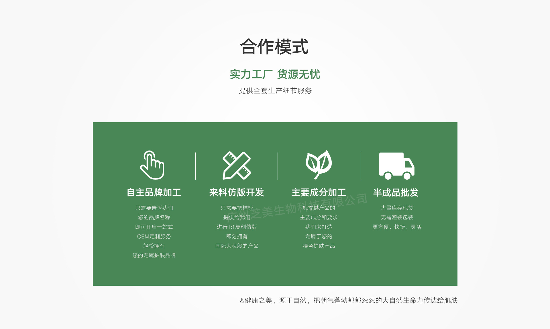 廣州芝美生物科技有限公司,是一家集生產、銷售、研發于一體的化妝品廠,公司占地兩萬平方米,擁有先進的機器設備、醫藥級車間、乳化間以及嚴謹的科研隊伍,我公司研發的多款產品成功的幫客戶打開市場,并在生產銷售中不斷提高產品質量、提升產品品質,成功幫助消費者占領中高市場。我司研發生產的面膜、洗面奶、水乳霜等化妝品及洗發水、沐浴露等日化用品、彩妝暢銷消費者市場,在消費者當中享有較高的地位,公司與多家零售商和代理商建立了長期穩定的合作關系。我司生產、經銷的化妝品、日化用品、彩妝品種齊全、價格合理。兼以我司實力雄厚,重信用、守合同、保證產品質量,以多品種經營特色和薄利多銷的原則,贏得了廣大客戶的信任。歡迎各界朋友蒞臨參觀、指導和業務洽談!