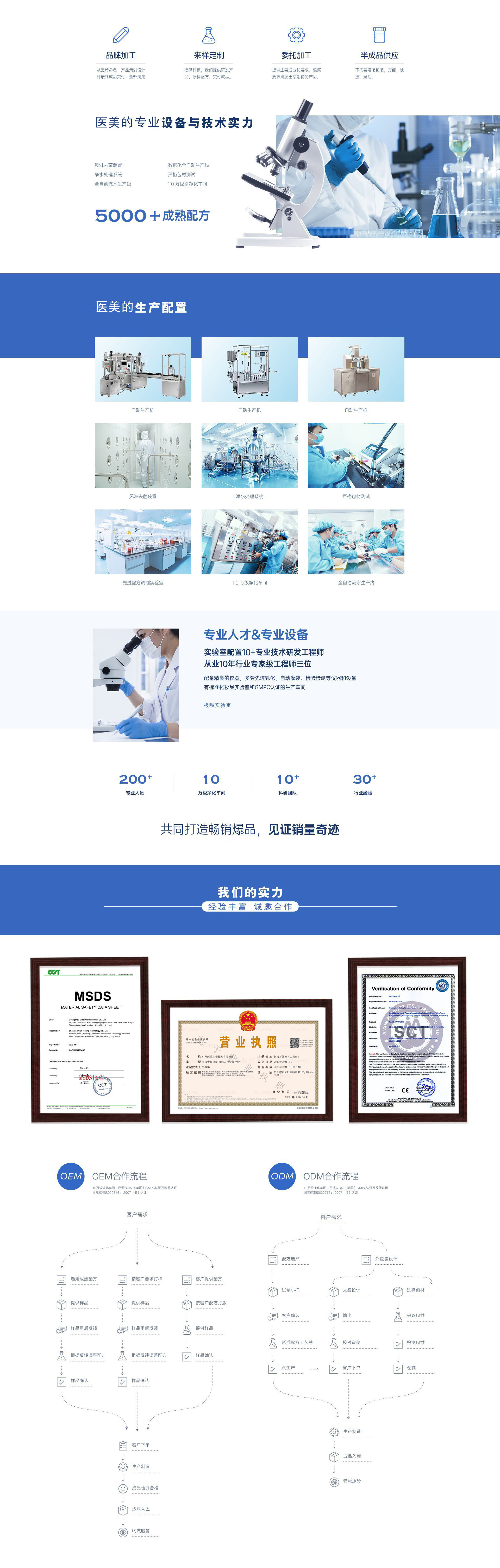 廣州醫(yī)美生物技術(shù)有限公司是- -家集研發(fā)、生產(chǎn)、銷售為一體的專業(yè)化妝品企業(yè),提供批發(fā)、零售、代理和代加工貼牌OEM/ODM服務(wù),我們所做的產(chǎn)品有眼霜,手霜,精油,精華液,原液,精華素,面膜,面膜貼、面貼膜,眼膜,眼膜貼,眼貼膜,面霜,臉?biāo)词忠海窗l(fā)水,沐浴露,祛斑產(chǎn)品,豐胸產(chǎn)品,減肥產(chǎn)品,脫毛產(chǎn)品,衣物柔順劑,洗衣液,廚房清潔劑,潔廁劑,地板清潔劑 在行業(yè)內(nèi)頗具口碑,坐落在交通便利、物流發(fā)達(dá)的廣州白云區(qū)龍歸。每年均通過ISO9001, GMPC(SGS),intertek深度認(rèn)證,并連續(xù)多年是廣州質(zhì)量協(xié)會(huì)單位。環(huán)境優(yōu)美,廠房面積45000平方米,生產(chǎn)車間環(huán)境完全按照GMPC認(rèn)證所需要的條件建設(shè),并- -次性通過 “IS09001-2008”質(zhì)量認(rèn)證和“GMPC”認(rèn)證。公司目前擁有多條現(xiàn)代化的生產(chǎn)線,多臺(tái)/套國(guó)際、國(guó)內(nèi)先進(jìn)乳化、自動(dòng)灌裝、滅菌、檢驗(yàn)檢測(cè)等儀器,具備各類膏霜、洗護(hù)、美容