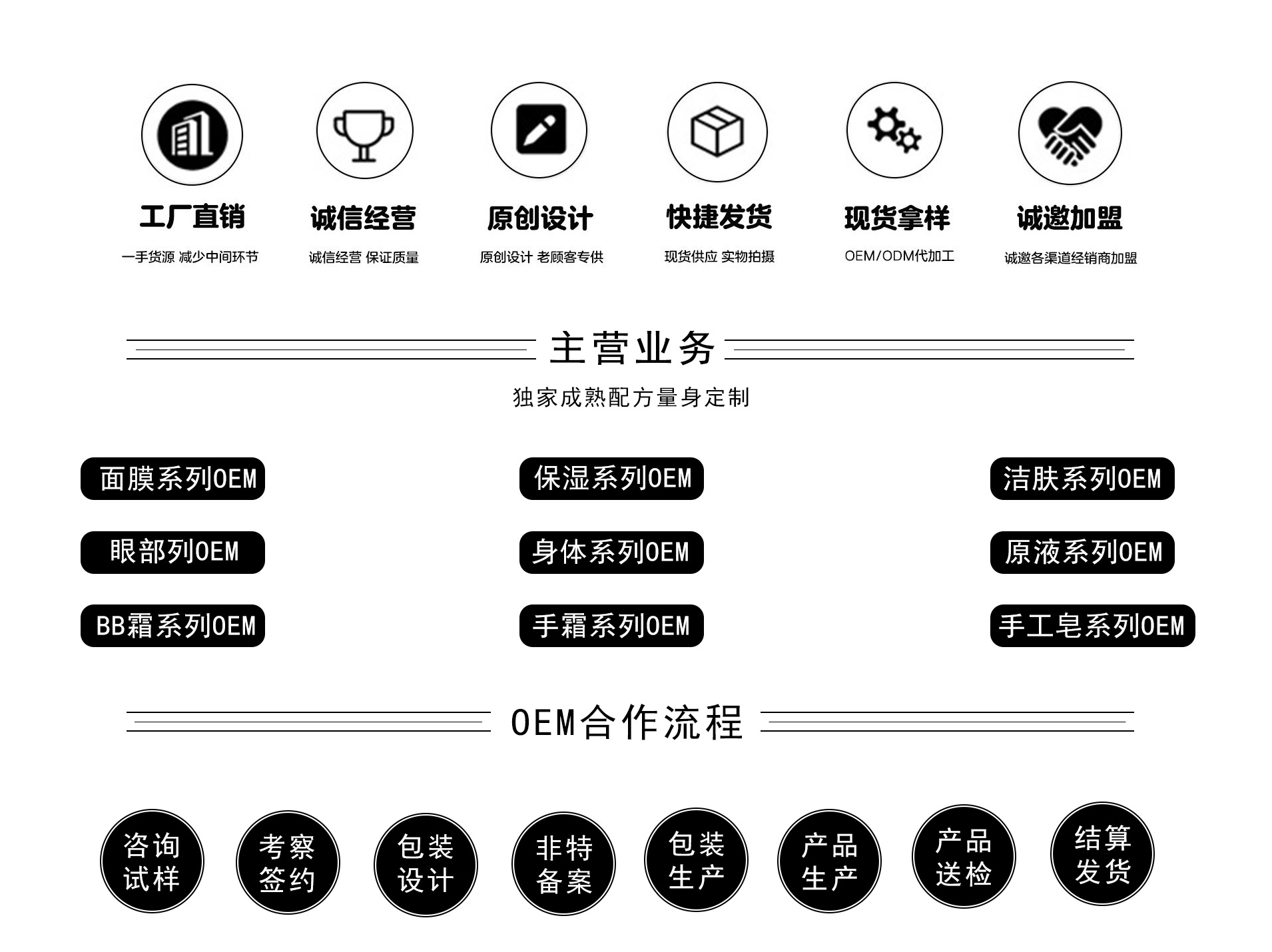 廣東黛美詩生物科技有限公司是化妝品、日化、面膜、護膚等產品專業生產加工的公司,擁有完整、科學的質量管理體系,服務于國內多家知名品牌,自主研發調配符合東方人膚質的配方,承接各類OEM、ODM,來樣加工等。 本公司致力于服務品牌電商代工、美容院代加工,真誠幫助客戶實現化妝品事業成功的夢想。尊重品牌客戶的不同需求,推出多套OEM解決方案,可為您生產出符合國際標準的優質化妝品。優惠的價格、快速的反應、直接的溝通盡顯盈姿服務的省心和專業。 一、廣東黛美詩生物科技有限公司主要客戶群: (1) 外商OEM貼牌加工 (2) 外貿公司有化妝品訂單 (3) 專業線,美容院想做自己品牌 (4) 有化妝品行業經驗的投資者要貼牌加工做品牌 (5) 想貼牌開發新品牌的經銷商或代理商 (6) 想自創品牌的代理商或經銷商 (7) 想改行投資化妝品行業的投資商 (8) 您擁有自己品牌的經銷商 (9) 剛入行經驗較少