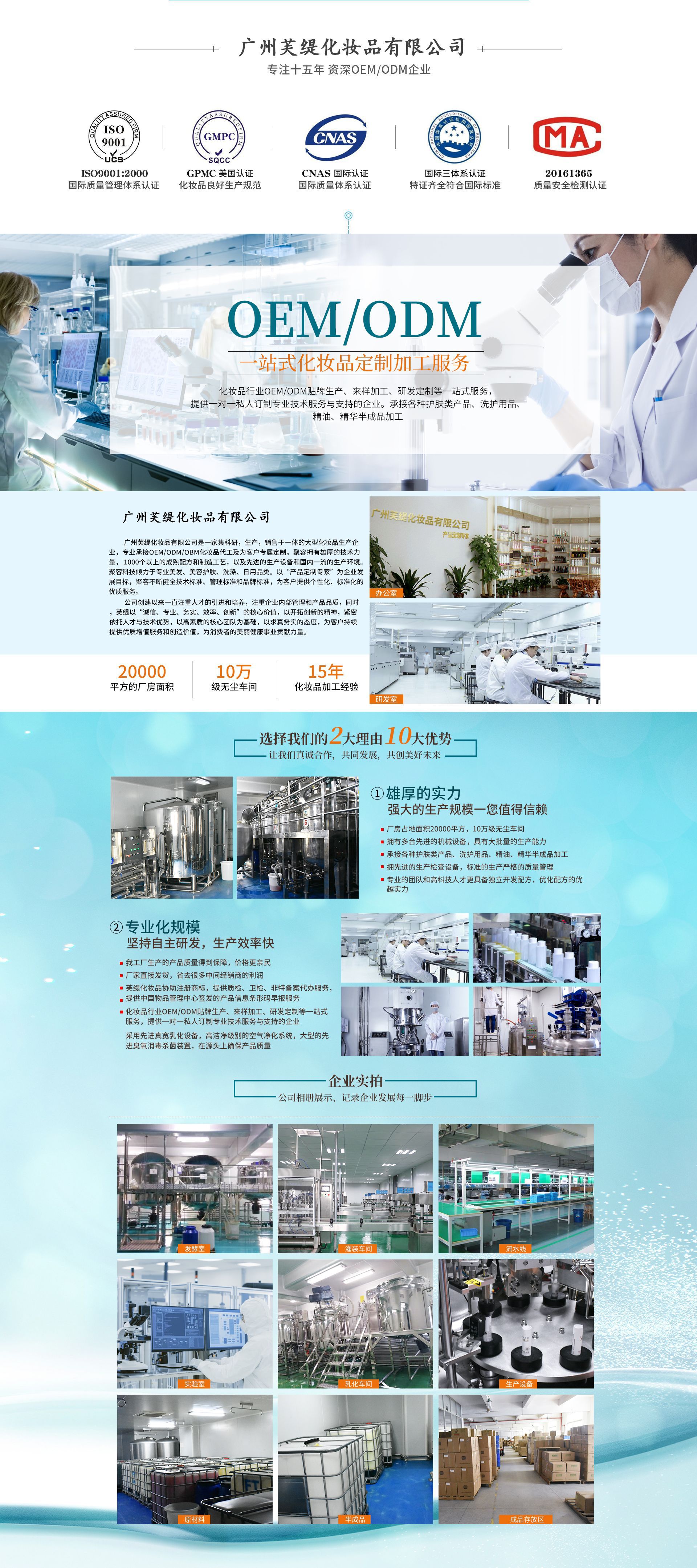 廣州市芙緹化妝品有限公司,于2004年創立,專業從事美容美發用品生產加工的企業,由 具有化妝品行業領先技術實力的團隊組建而成。集產品研發、產品設計、產品營銷、教 育培訓于一體。企業目前主要以美發類化妝品生產為主,熱誠為廣大客戶提供OEM服 務。公司致力于以高技術核心、高品質服務,為客戶提供高品質的專業產品為已任, 并在獨立自主的基礎上研究,發展公司的核心技術體系,并針對客戶的不同需求, 提供量身定做的多種專業產品及服。