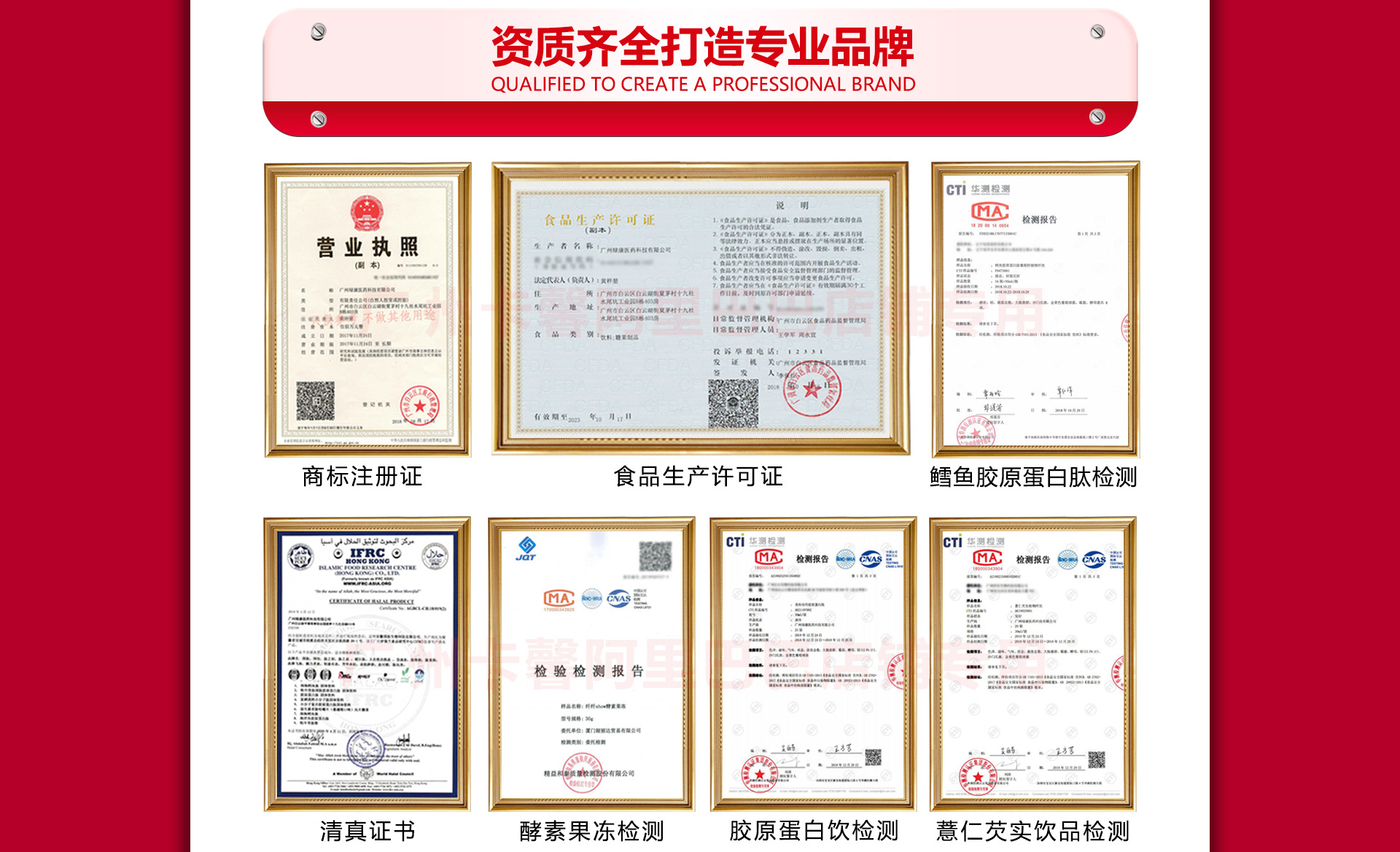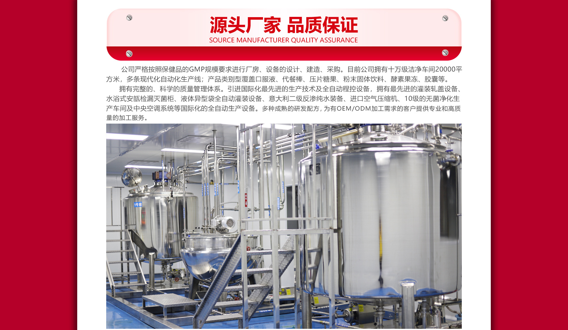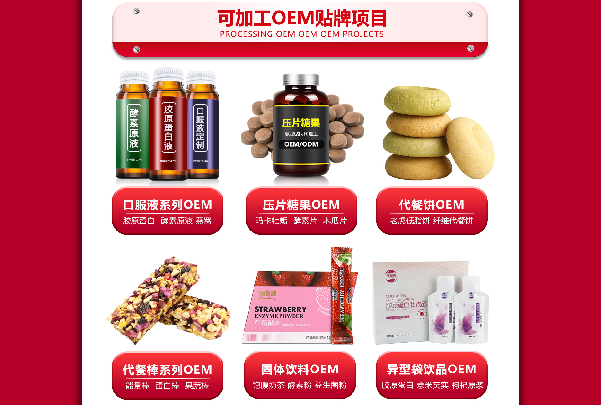 廣州市卡馨保健食品有限公司是一家專注于現代生物健康產品集研發、生產、銷售、服務為一體的綜合性現代化企業; 公司通過了HACCP、ISO2200、認證,具備完整的產品質量控制和保障體系,公司自成立以來,已擁有獨立產品研發實驗室,擁有強大的研發團隊,高級專業技術人才,獲高新技術生產工廠企業。 公司以強大的技術支持平臺、國家規范化管理工廠為依托,并與國內多家集團企業公司等機構達成了長期的技術合作伙伴關系。 我們對外提供OEM一站式服務,主要從事業務范圍是對固體飲料、片劑 壓片糖果、軟硬膠囊、酵素果凍、酵素液體等等系列新產品的開發、生產、包裝、銷售及OEM一條龍服務。廣州市卡馨保健食品有限公司的誠信、實力和產品質量獲得業界的認可。歡迎各界朋友蒞臨參觀、指導和業務洽談。