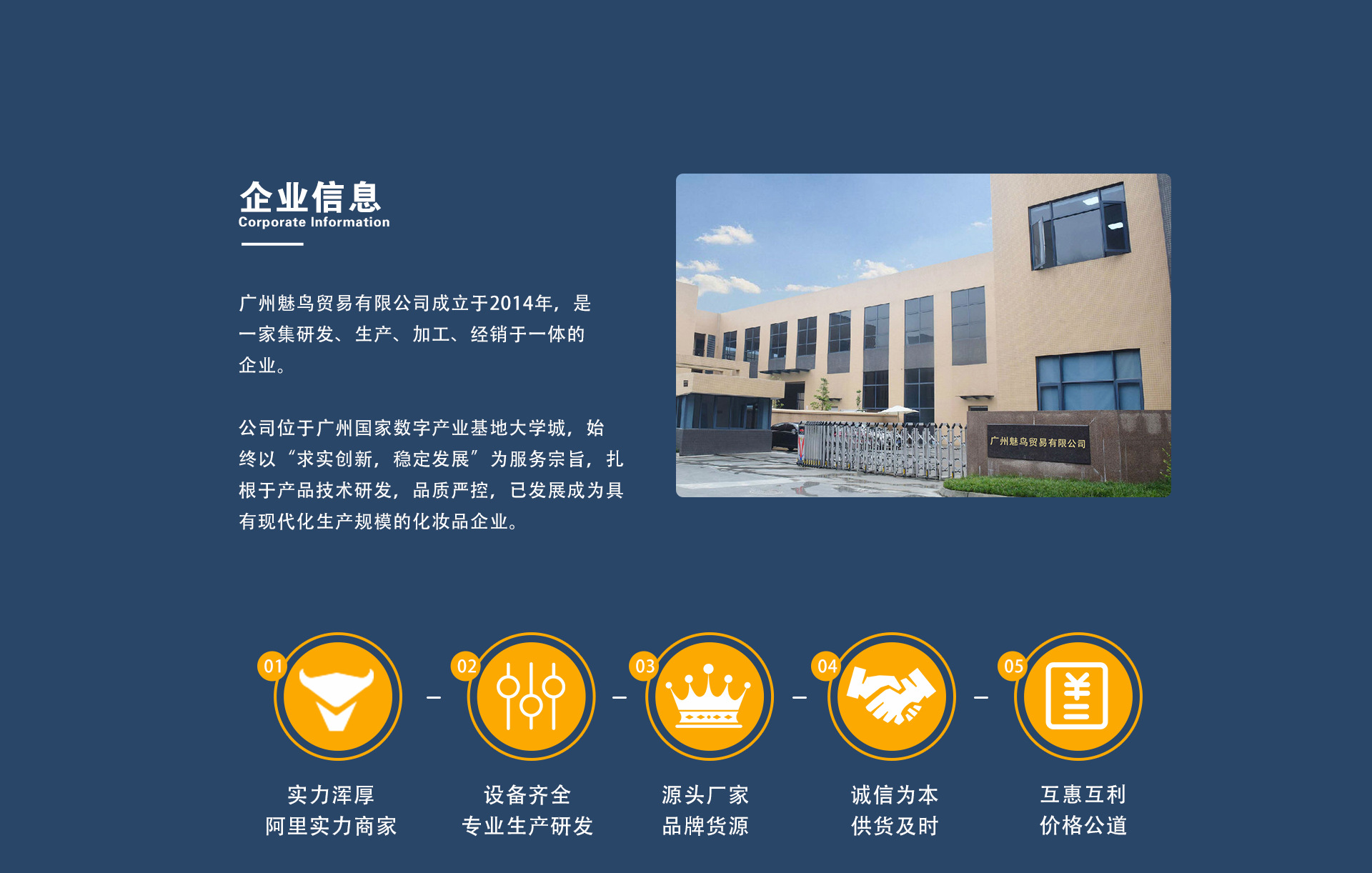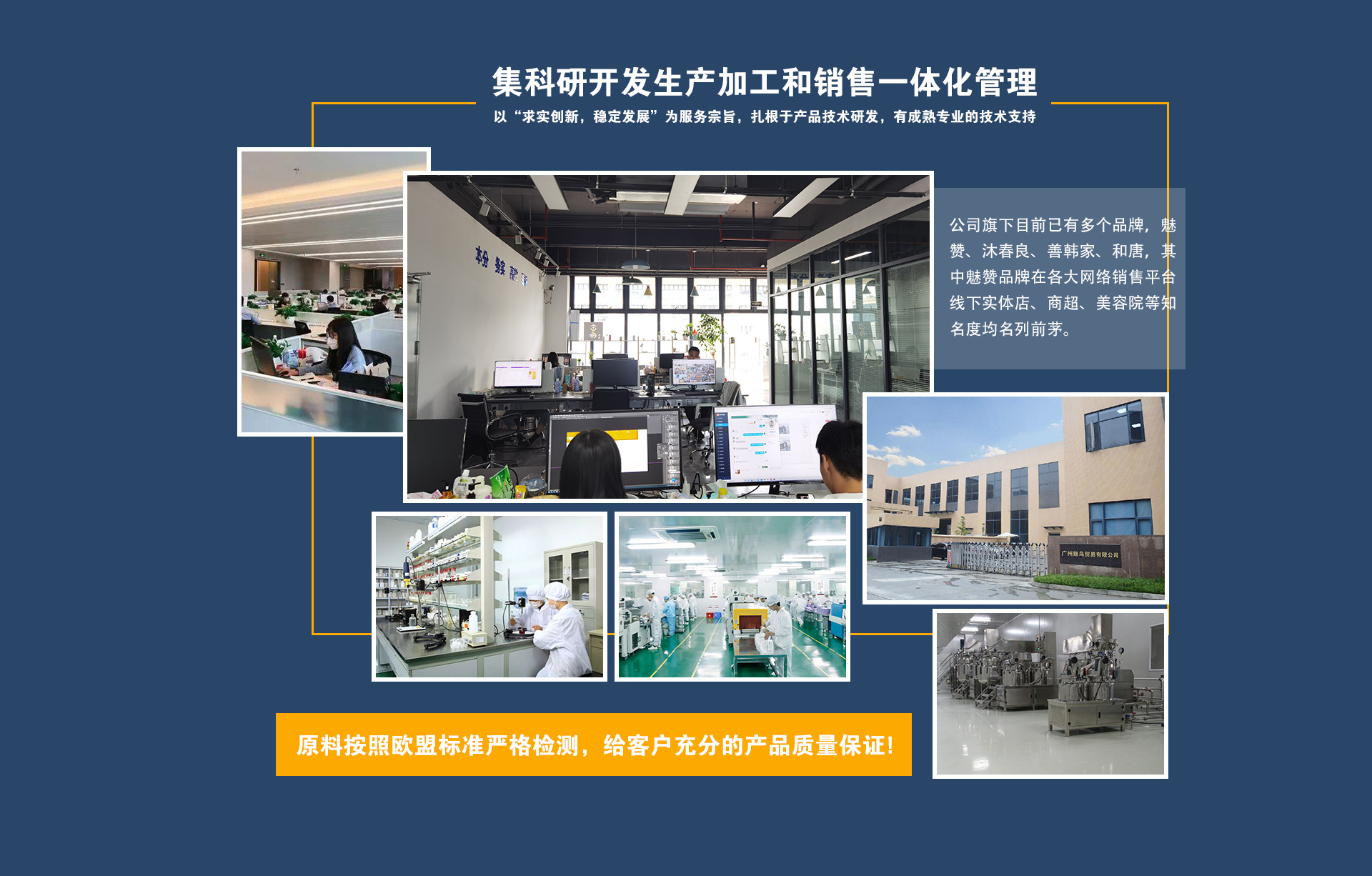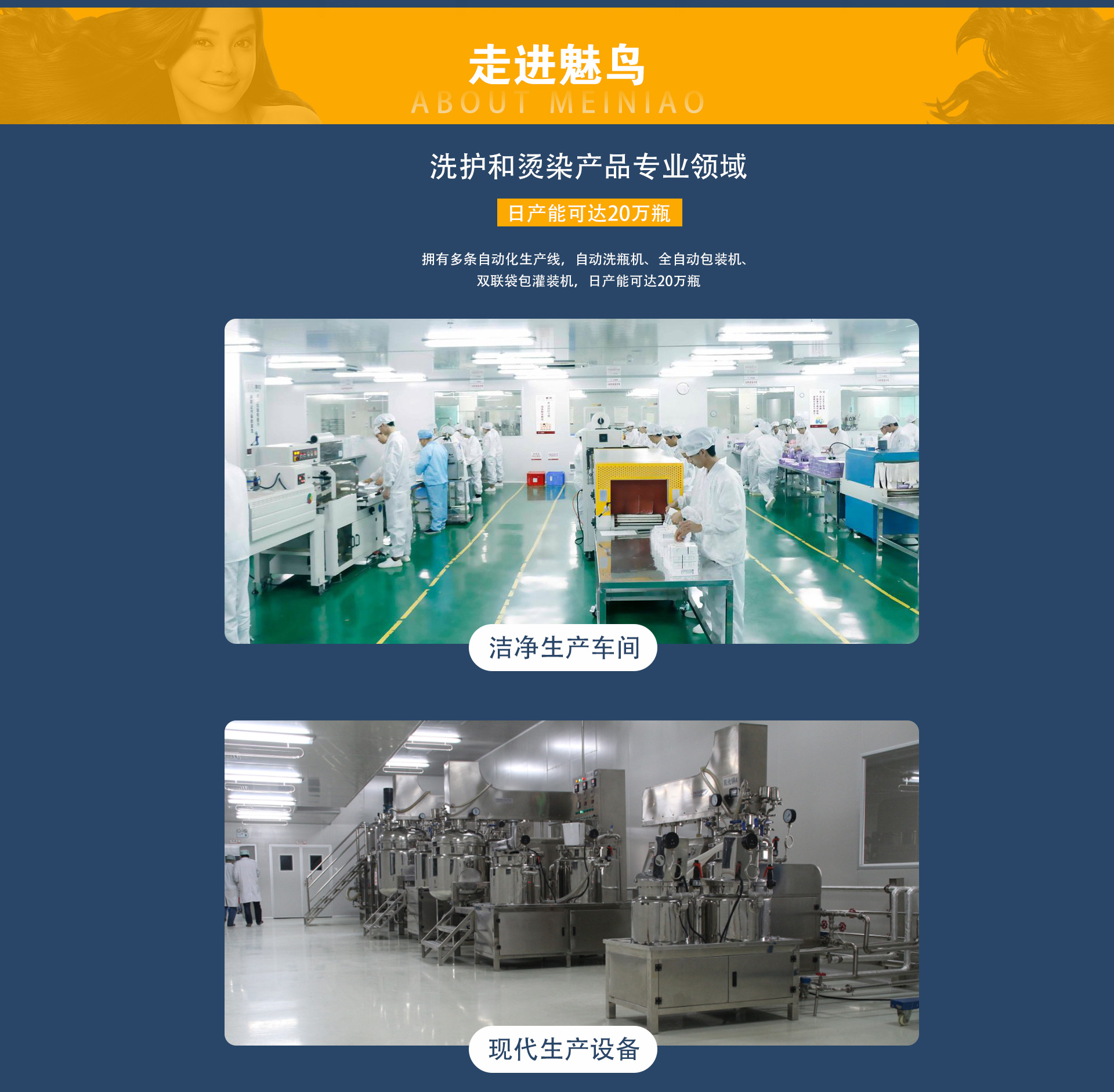 廣州魅鳥貿易有限公司是集洗發水、沐浴露、護發素、染發劑、護發劑等產品專業生產加工的公司,集研發、生產、銷售、為一體化的實力公司,經過多年生產開發,成功的開發出了一系列的專業線、日化線美發用品品牌;旗下品牌分別有“魅贊”、“沐春良”、“善韓家“等系列 生產車間環境完全按照GMPC的標準來建設,擁有1000平方米的先進化實驗室和10萬級別灌裝車間。