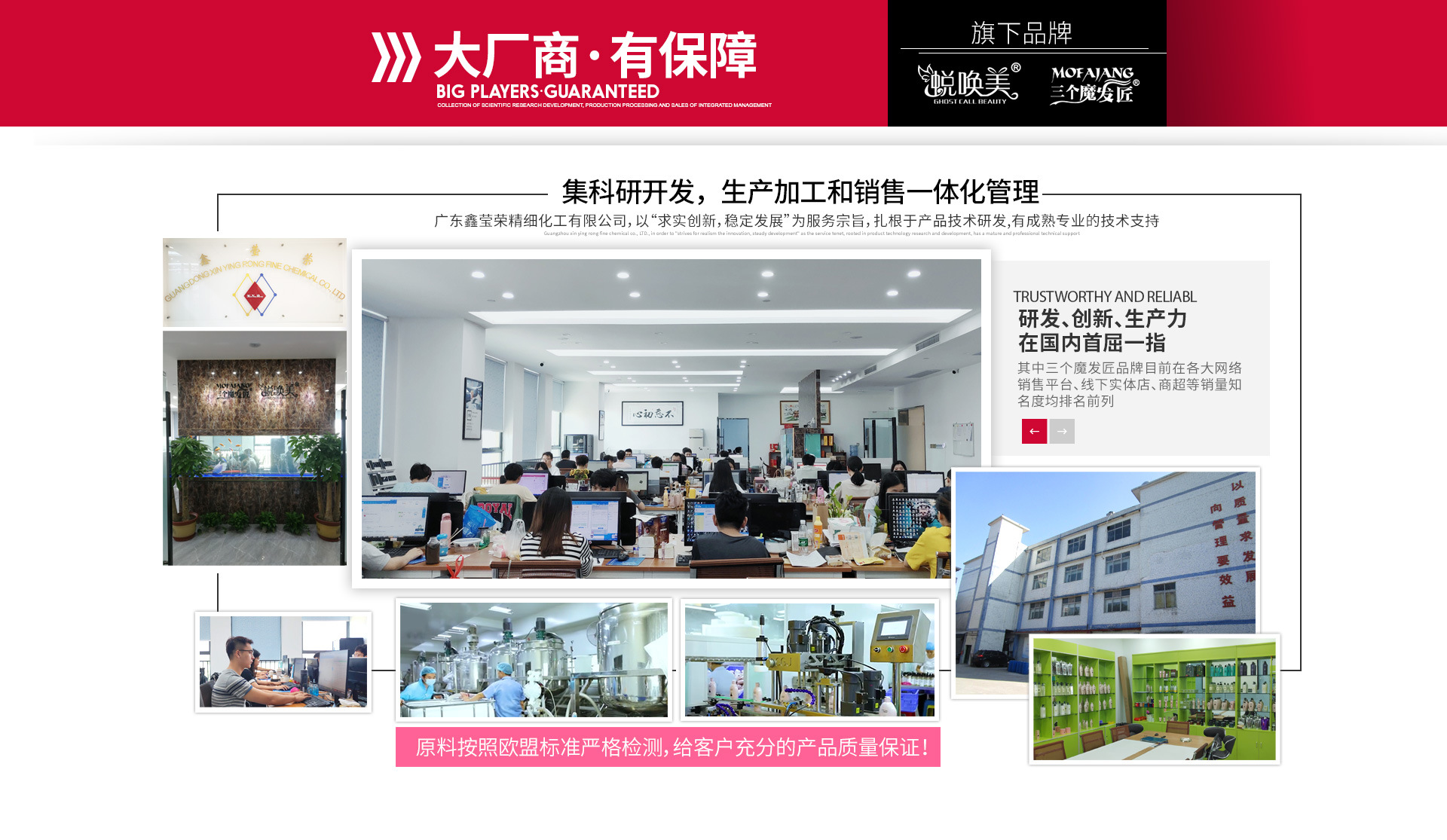 廣東鑫瑩榮精細(xì)化工有限公司成立于2004年,是集研發(fā)、生產(chǎn)、銷售、為一體化的實(shí)力公司,經(jīng)過十余年生產(chǎn)研發(fā) 成功的開發(fā)出了一系列的專業(yè)線、日化線美發(fā)護(hù)膚用品品牌;旗下品牌分別有“三個(gè)魔發(fā)匠”、“蛻喚美”、“等系列,生產(chǎn)車間環(huán)境完全按照GMPC的標(biāo)準(zhǔn)來建設(shè),擁有1500平方米的先進(jìn)化實(shí)驗(yàn)室和10萬級(jí)別灌裝車間。
