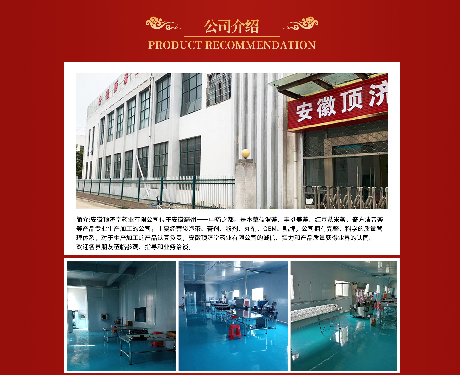 安徽頂濟堂藥業有限公司是袋泡茶茶、花草茶茶、方便食品、丸劑膏劑等產品專業生產加工的公司,擁有完整、科學的質量管理體系。安徽頂濟堂藥業有限公司的誠信、實力和產品質量獲得業界的認可。歡迎各界朋友蒞臨參觀、指導和業務洽談。