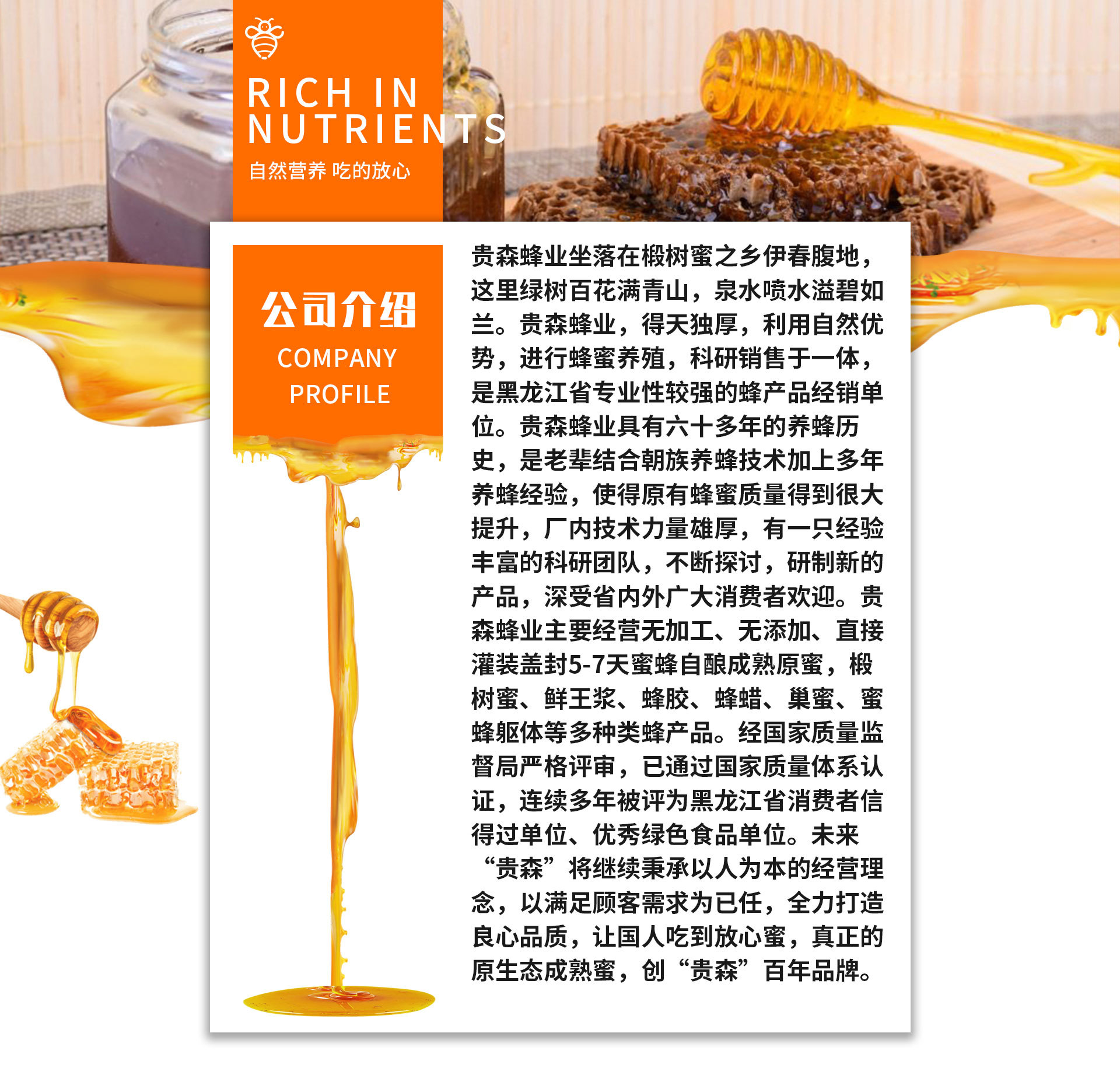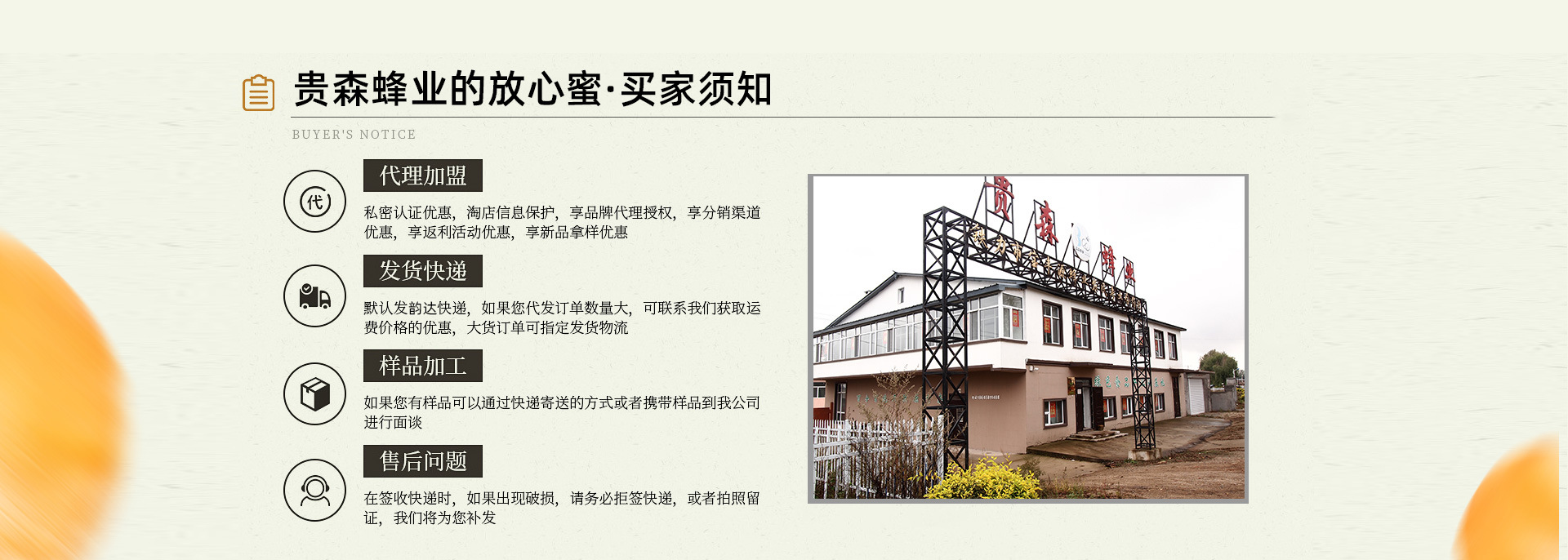 貴森蜂業座落在椴樹蜜之鄉林都伊春腹地,這里綠樹百花滿青山,泉水噴水溢碧如蘭,貴森蜂業,得天獨厚,利用自然優勢,進行蜜蜂養殖,科研銷售于一體,是黑龍江省專業性較強的蜂產品經銷單位。 貴森蜂業有2000平方米廠房,60多年的養蜂歷史,老輩結合朝族養蜂技術加多年養蜂經驗,使原有蜂蜜質量得到更大提高,更加純正。廠內技術力量雄厚,有一支經驗豐富的科研團隊,不斷探討、研制新的產品,深受省內外廣大消費者歡迎。 貴森蜂業主要經營無加工、直接灌裝蓋封的5-7天蜜蜂自釀成熟原蜜,椴樹蜜、多種山花粉、鮮王漿、蜂膠、蜂蠟、巢蜜、蜜蜂軀體等多種類蜂產品。經國家質量監督局嚴格評審,已通過國家質量體系認證,連續多年被評為黑龍江省消費者信得過單位、優秀綠色食品單位。 未來“貴森”將繼續秉承以人為本的經營理念,以滿足顧客需求為己任,全力打造良心品質,讓國人吃到放心蜜,真正的原生態成熟蜜。