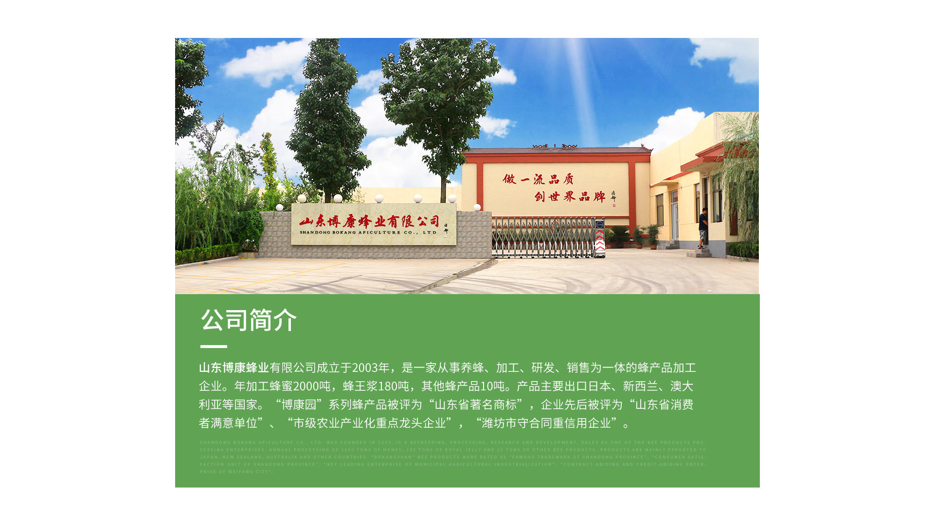 山東博康蜂業有限公司公司成立于2003年,座落于國家5A級森林公園-沂山腳下。專業從事養蜂、加工、研發、銷售為一體的蜂產品加工企業。占地14790㎡,建有符合GMP要求的生產車間3024㎡,擁有專業技術人員32人,并成立了博康蜂業專業合作社 ,設有“沂山聯合養蜂基地”,“沂源聯合養蜂基地”,“魯山自屬養蜂基地”。現有養蜂場245個、蜂群36680群。年加工蜂蜜2000噸,年加工蜂王漿180噸,其他蜂產品(蜂花粉、蜂膠、蜂蠟、雄蜂蛹、王漿幼蟲等)10噸,產品遠銷日、新西蘭、澳大利亞等國家。  公司通過了SC認證;食品出口衛生認證;ISO9001:2015和HACCP質量體系認證及《采用國際標準產品標志證書》和《企業產品采用國際標準確認可證》,建立符合蜂產品檢測要求的研發中心一處,為保證食品安全和產品質量提供了可靠保障,山東博康蜂業有限公司歡迎您來參觀考察。