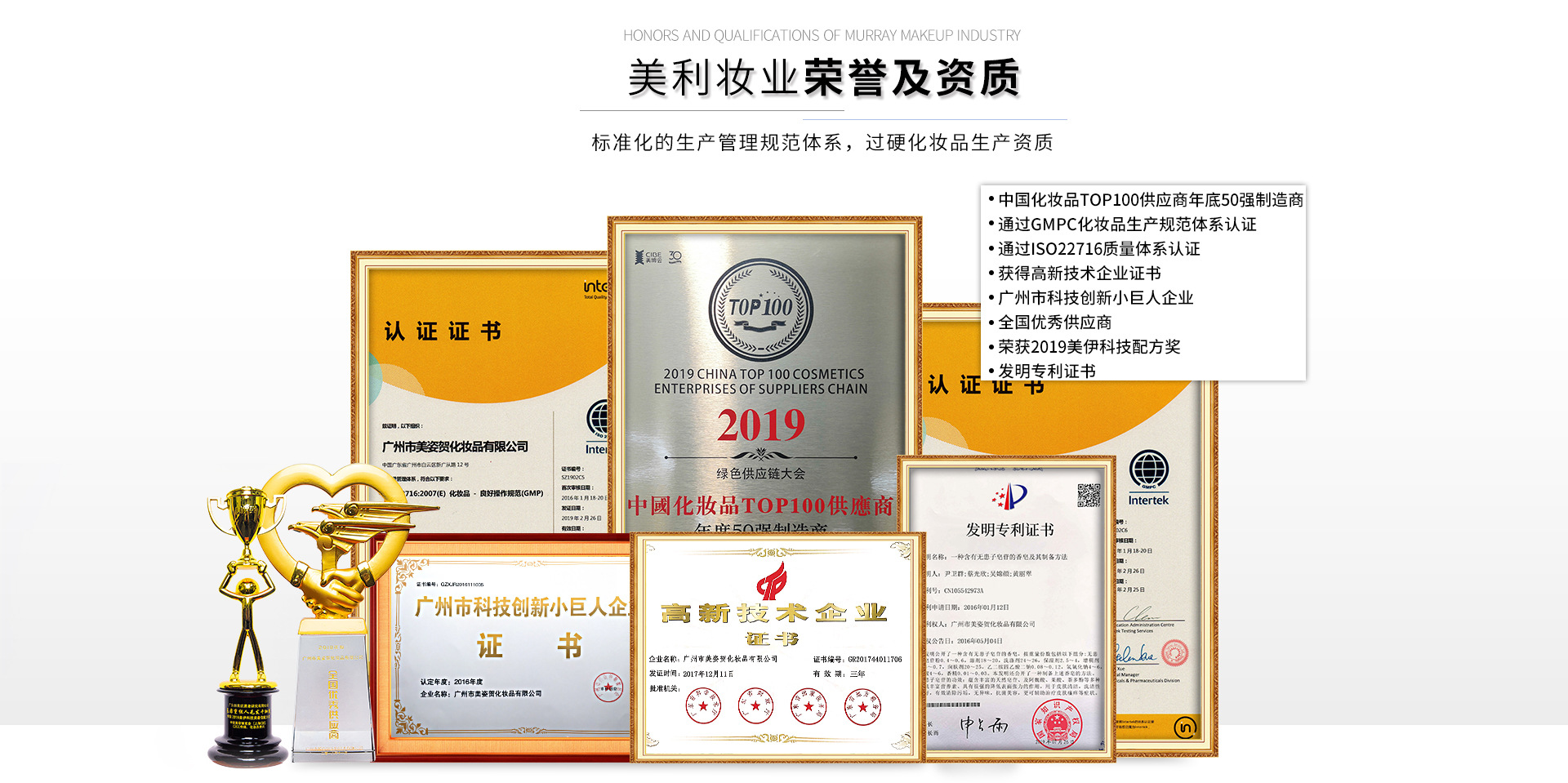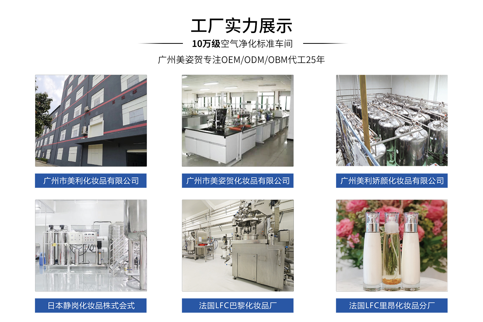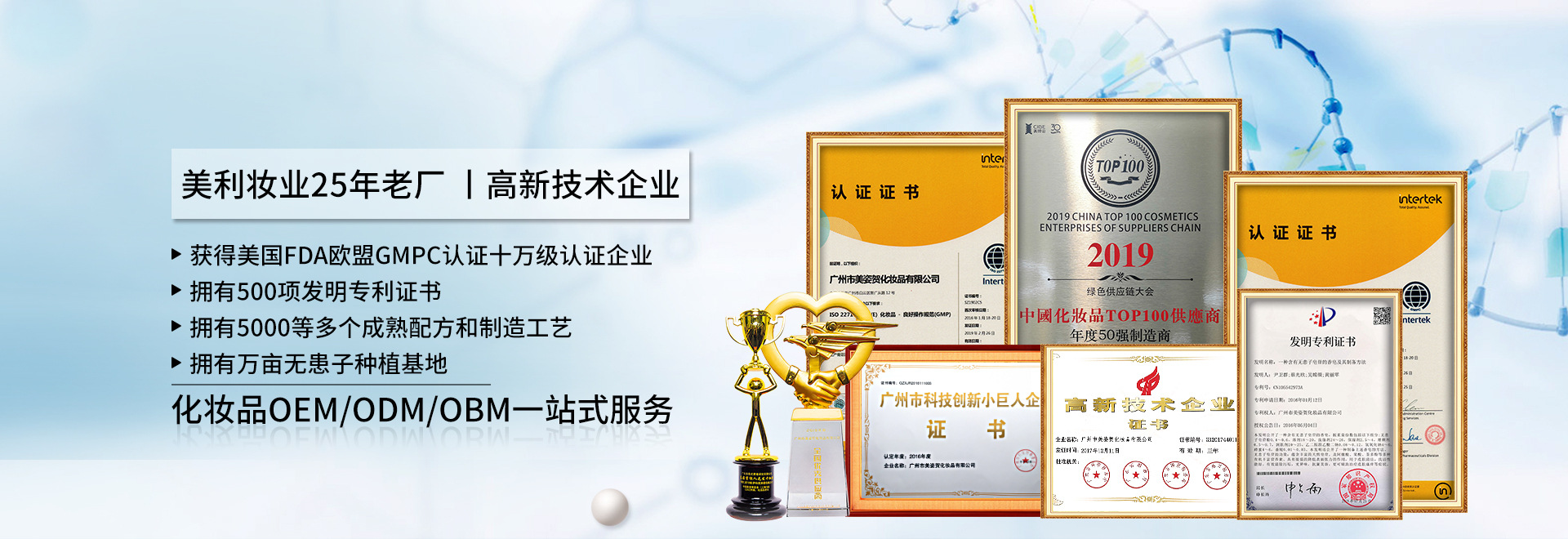 美利妝業集團專業化妝品OEM/ODM/OBM一站式代加工廠家。25年風雨兼程,美利妝業集團堅持專注于OEM/ODM/OBM化妝品行業,堅持“給品牌一顆世界級芯”的經營理念。擁有專業100多個生物化工博士碩士組成的科研團隊,5000多項技術配方,儲備超過500項儲備專利技術,擁有32項核心技術與擁有2家遵照國際ISO、GMPC雙認證標準工廠(美利化妝品廠與美資賀化妝品廠)和國內的抗衰老化妝品研發平臺---創美研究院,其中有七個研究所。美利妝業一站式助力中國民族品牌發展,服務超過三千多個化妝品品牌,已經有很多品牌占有國內外一線市場。