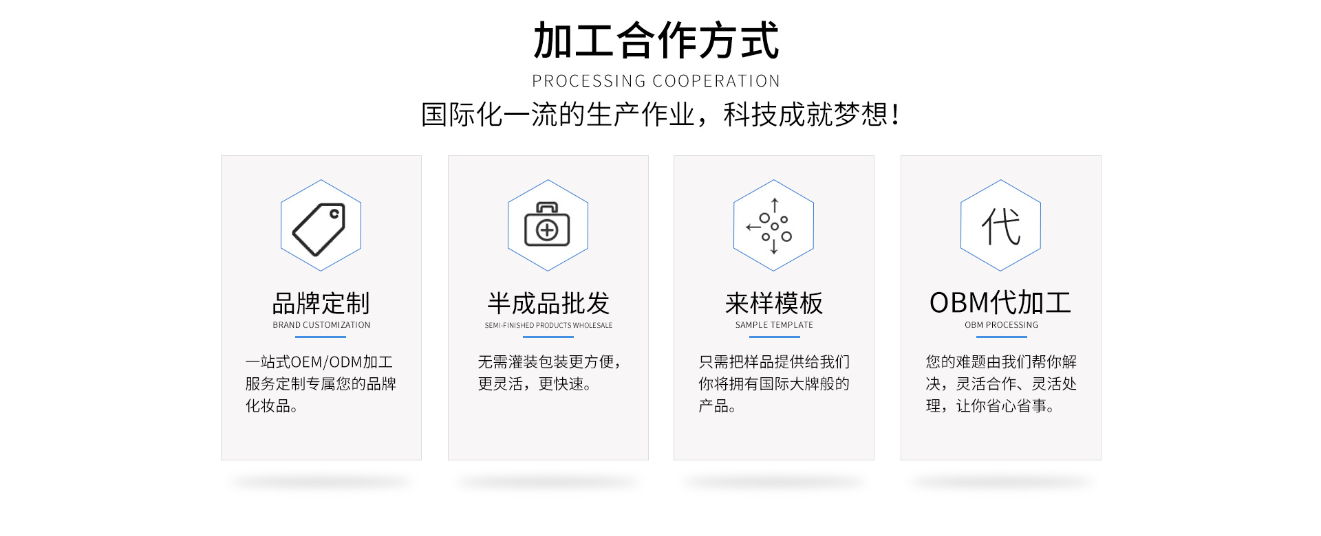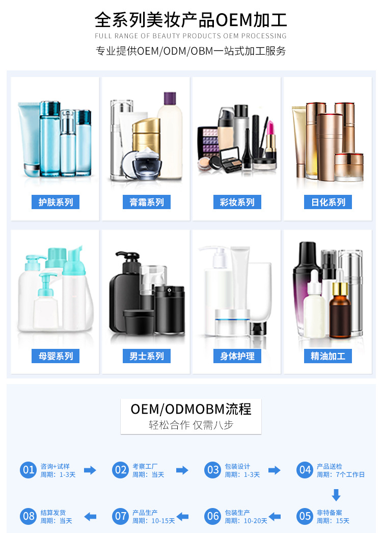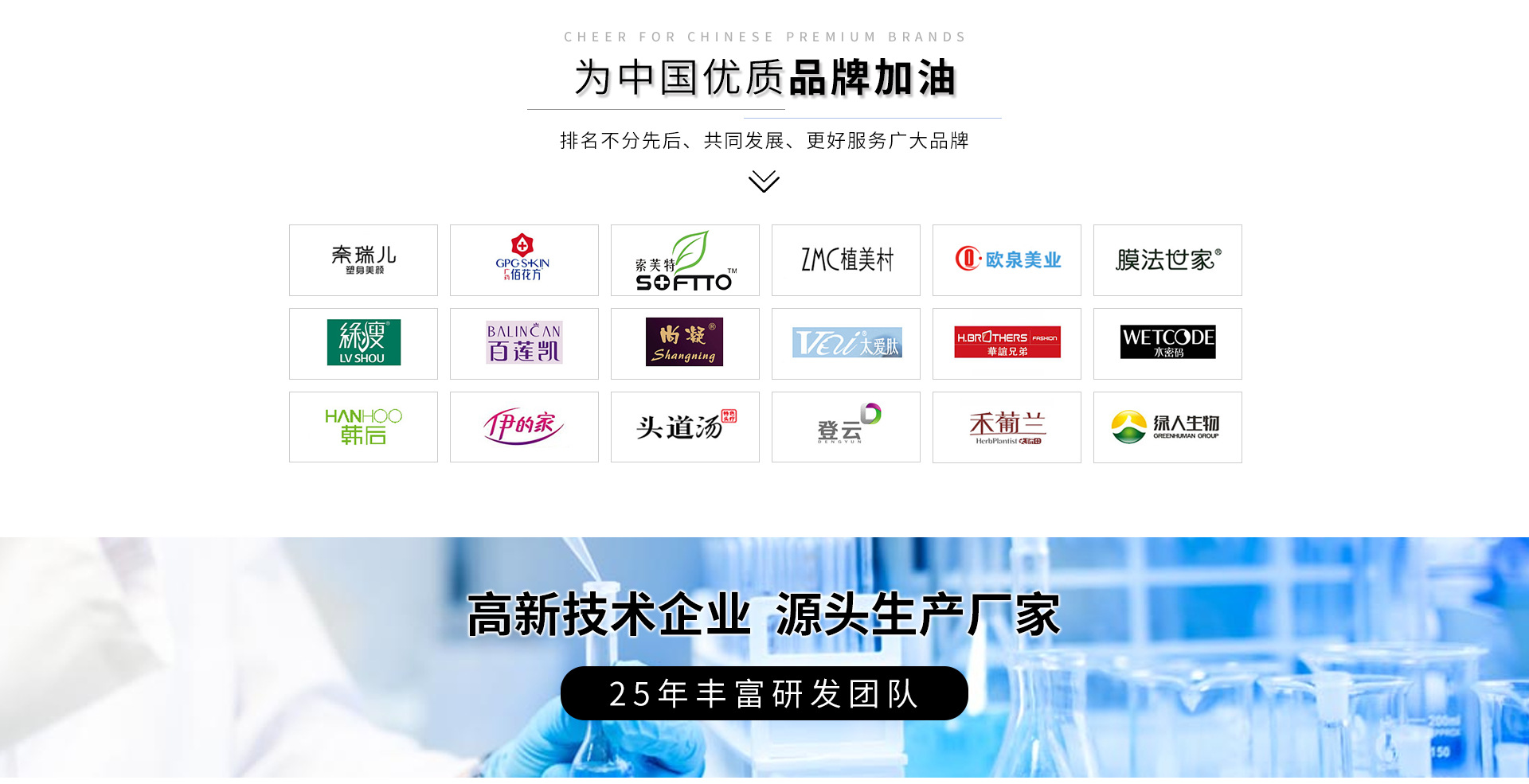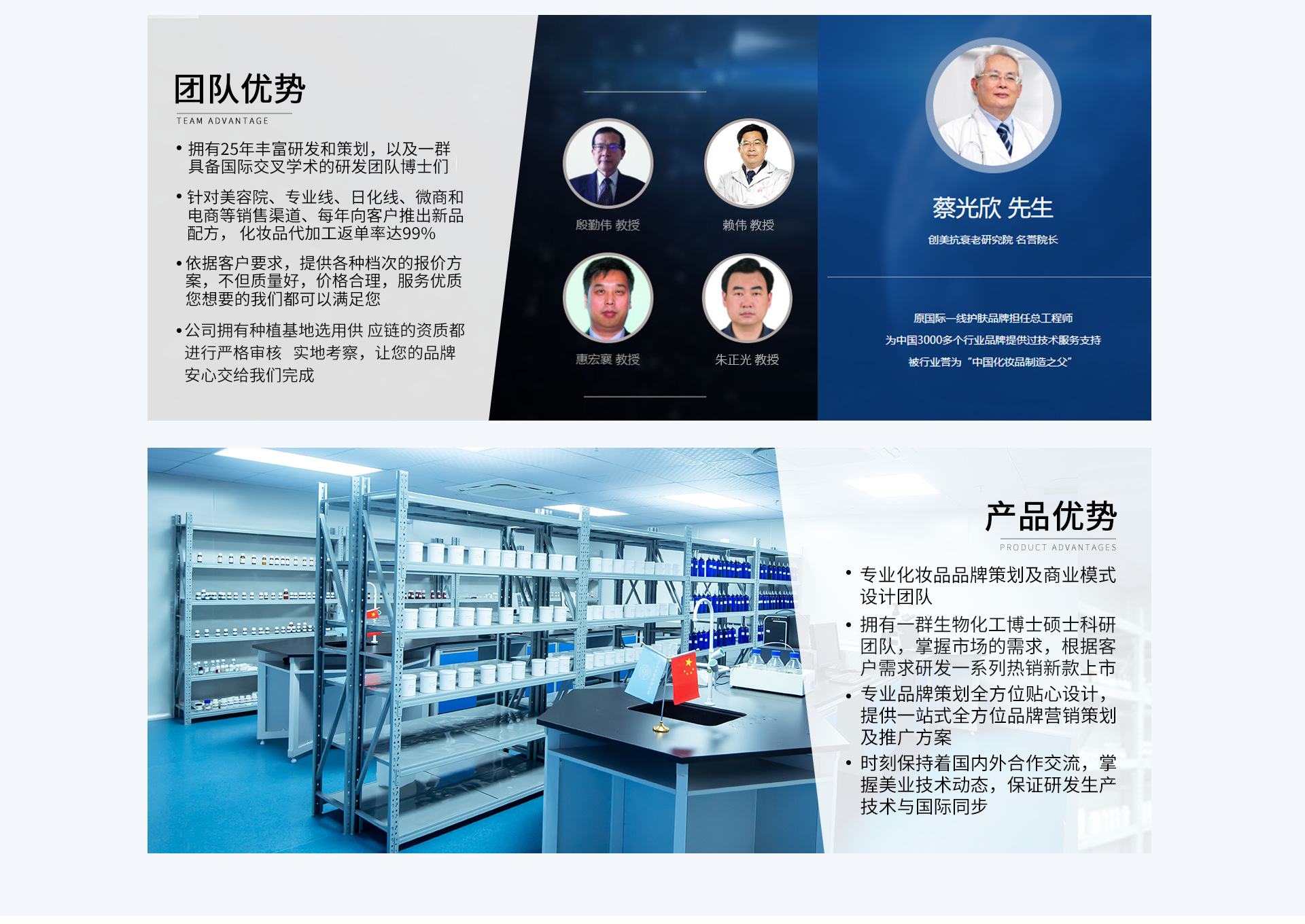 美利妝業集團專業化妝品OEM/ODM/OBM一站式代加工廠家。25年風雨兼程,美利妝業集團堅持專注于OEM/ODM/OBM化妝品行業,堅持“給品牌一顆世界級芯”的經營理念。擁有專業100多個生物化工博士碩士組成的科研團隊,5000多項技術配方,儲備超過500項儲備專利技術,擁有32項核心技術與擁有2家遵照國際ISO、GMPC雙認證標準工廠(美利化妝品廠與美資賀化妝品廠)和國內的抗衰老化妝品研發平臺---創美研究院,其中有七個研究所。美利妝業一站式助力中國民族品牌發展,服務超過三千多個化妝品品牌,已經有很多品牌占有國內外一線市場。