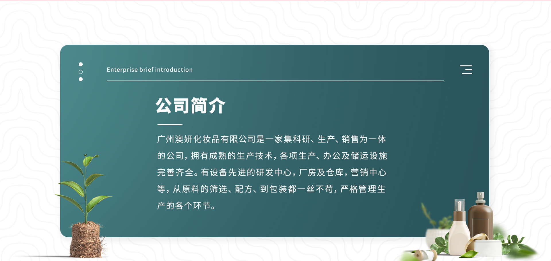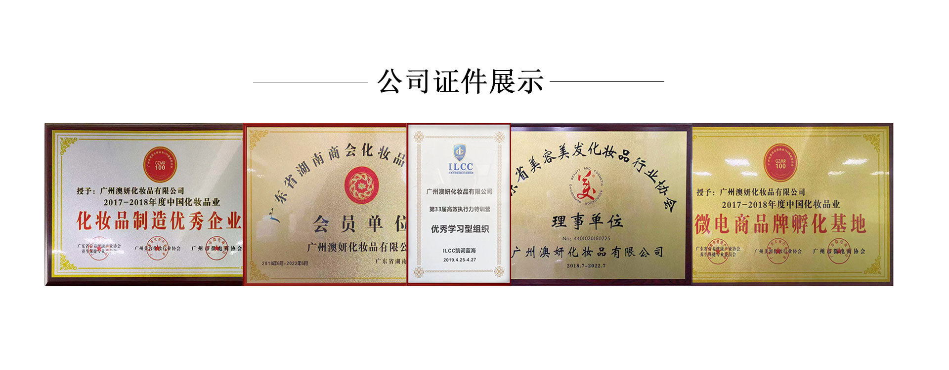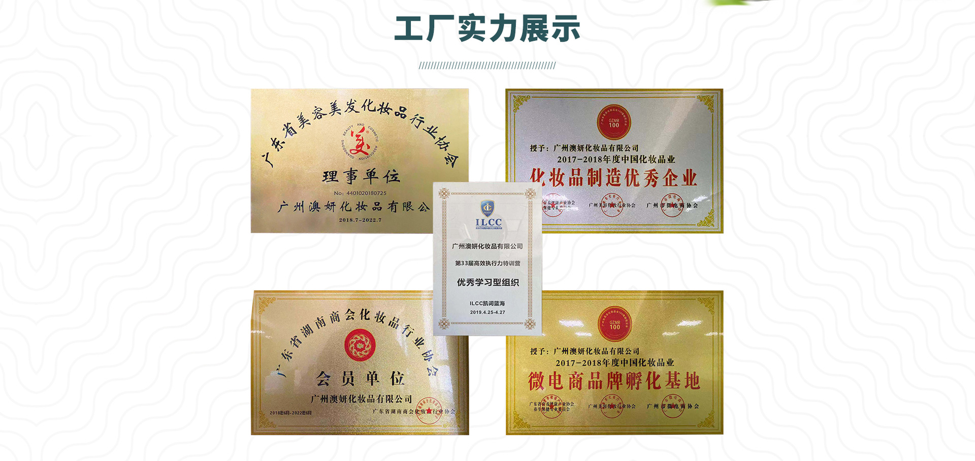 廣州澳妍化妝品有限公司是一家集科研、生產、銷售為一體的公司,擁有成熟的生產技術,各項生產、辦公及儲運設施完善齊全。有設備先進的研發中心,廠房及倉庫,營銷中心等,從原料的篩選、配方、到包裝都一絲不茍,嚴格管理生產的各個環節。 現在阿里巴巴網上推出我公司產品,為想加入化妝品行業人士提供小額批發、OEM貼牌代加工,讓您用小小的資金實現您大大的創業夢想。