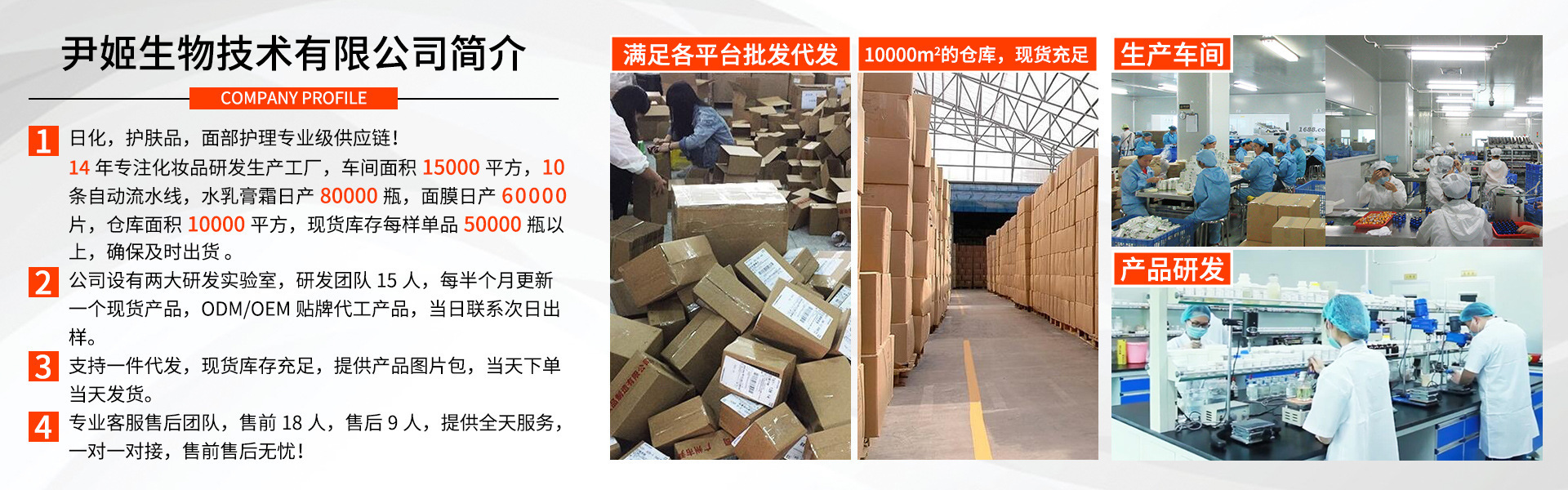 廣州市耐博生物科有限公司是一家集研發、生產為一體的專業化妝品企業,提供批發、零售、代理和代加工貼牌OEM/ODM服務,我們所的產品有供眼霜,手霜,精油,精華液,原液,精華素,面膜,面膜貼、面貼膜,眼膜,眼膜貼,眼貼膜,面霜,臉霜,洗手液,洗發水,沐浴露,祛斑產品,豐胸產品,減肥產品,脫毛產品,衣物柔順劑,洗衣液,廚房清潔劑,潔廁劑,地板清潔劑等。 公司廠區環境優美,生產車間環境完全按照GMPC認證所需要的條件建設,并通過“IS09001-2008” 質量認證和“GMPC”認證。目前擁有多條現代化的生產線,多臺/套國際、國內先進乳化、自動灌裝、滅菌、檢驗檢測等儀器,具備各類膏霜、洗護、美容化妝產品的生產條件和能力,年生產能力可達到數千萬支,同時工廠不僅能生產各種形態、規格、品種的化妝品,還能實現化妝品常規檢驗項目的檢測,全方位保證企業的產品在消費者手中的安全使用,讓消費者放心消費。