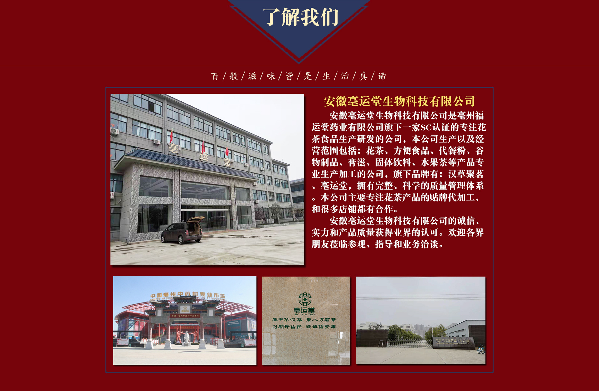 安徽亳運堂生物科技有限公司是亳州福運堂藥業有限公司旗下一家SC認證的專注花茶食品生產研發的公司,本公司生產以及經營范圍包括:代用茶、茶制品、方便食品、代餐粉、固體飲料、谷制物品、膏滋、水果茶等,旗下品牌有:漢草聚茗、亳運堂、甄之谷。本公司主要專注花茶產品的貼牌代加工,和很多知名天貓淘寶店合作。 本公司主要以批發為主,專注花茶產品的貼牌代加工,為各大商超和電商提供貨源!