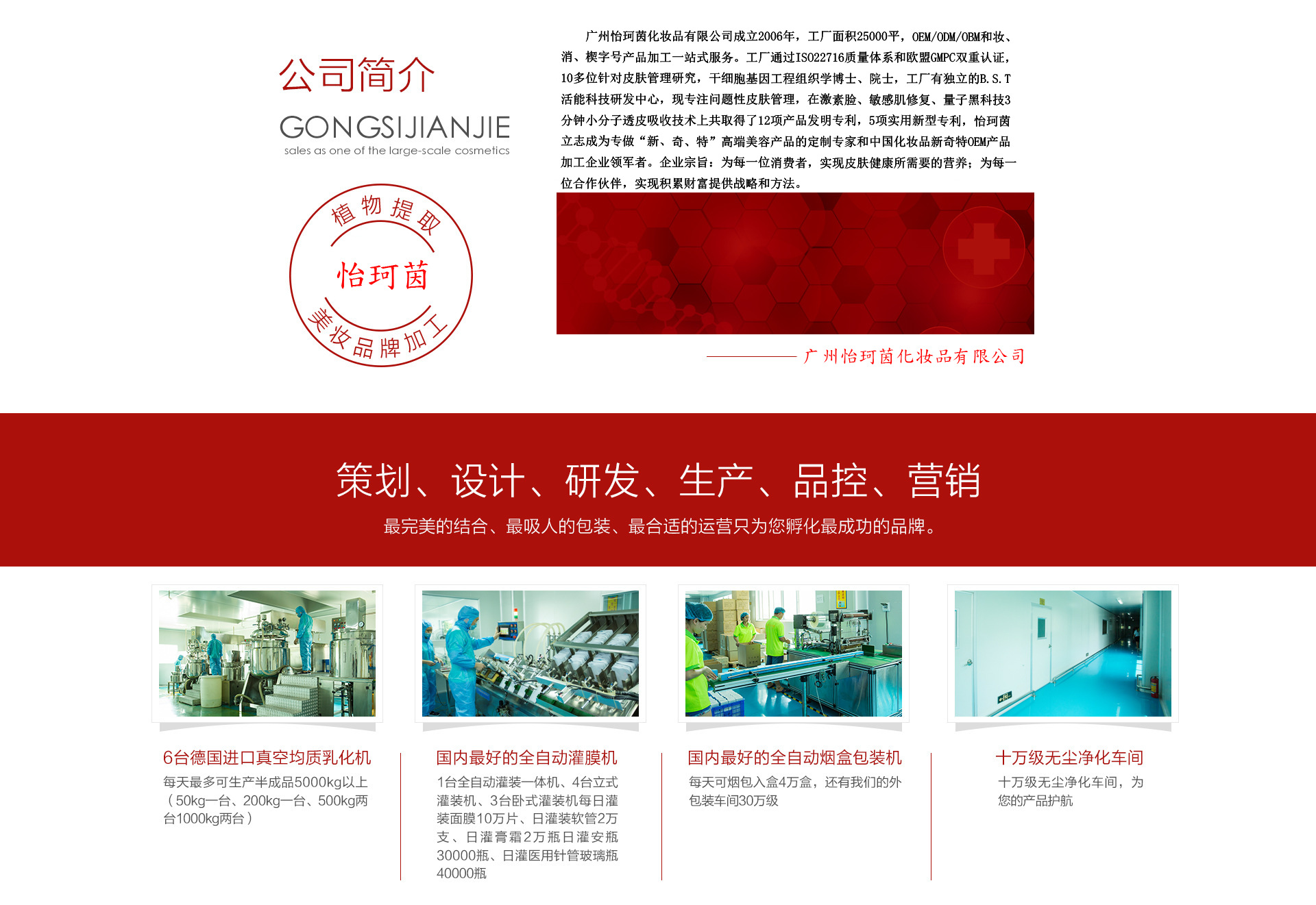 廣東怡珂茵化妝品有限公司,成立2006年,工廠面積30000平,OEM/ODM/OBM和妝、消、楔字號產品加工一站式服務。工廠通過ISO22716質量體系和歐盟GMPC雙重認證,10多位針對皮膚管理研究,干細胞基因工程組織學博士、院士,臺灣資生堂沉淀美業38年科研工程師/博士/技術廠長--蔡博士作為技術顧問,雅蘭國際雅純首席工程師、棟方(幸美)股份首席工程師吳博士為企業創始人。 工廠有獨立的B.S.T活能科技研發中心,現專注問題性皮膚管理,在激素臉、敏感肌修復、量子黑科技3分鐘小分子透皮吸收技術上共取得了12項產品發明專利,5項實用新型專利,怡珂茵立志成為專做“新、奇、特”高端美容產品的定制專家和中國化妝品新奇特OEM產品加工企業領軍者。 企業宗旨:為每一位消費者,實現皮膚健康所需要的營養;為每一位合作伙伴,實現積累財富提供戰略和方法。